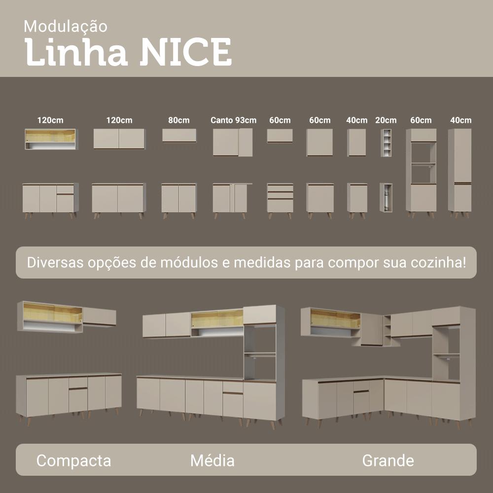 A Cozinha Compacta de 180 cm da linha Nice é a solução ideal para quem precisa de praticidade. Um dos grandes diferenciais dessa cozinha é o nicho aéreo, que oferece espaço para acomodar forno ou micro-ondas, otimizando ainda mais a organização e funcionalidade do ambiente.A linha Nice chega em uma versão no tom crema, tonalidade que proporciona uma sensação de aconchego e leveza. Os puxadores em tom bronze metalizado e os pés em bronze sólido são detalhes que valorizam o design trazendo um toque contemporâneo.Produzido com materiais de qualidade, o balcão conta com dobradiças metálicas nas portas e puxadores em perfil de alumínio, discretos e resistentes. As gavetas possuem corrediças que permitem abertura total, oferecendo mais praticidade. O tampo é removível, possibilitando a instalação de cuba ou pedra e o acabamento é de alta resistência, garantindo durabilidade no uso diário.Medidas totais:- 211 cm de altura- 180 cm de largura- 52 cm de profundidade nos balcões, 31 cm no aéreo e 45 cm no nicho de micro-ondasO que você recebe:- Um Armário Aéreo de 120 cm com duas portas- Um Nicho aéreo de 60 cm com espaço para forno- Um Balcão de 120 cm com três portas e uma gaveta- Um Balcão de 60 cm com uma portaCódigo do produto: GRNC1800027PÉ importante saber:- Material: MDP- Imagens meramente ilustrativas, a decoração não acompanha o produto.- A Madesa não oferece serviço de montagem.- O produto segue com manual e todas as ferragens necessárias para a instalação.A Madesa se dedica à sustentabilidade com várias iniciativas: temos uma usina própria que gera energia para uma das fábricas. Priorizamos fornecedores responsáveis com o meio ambiente. Todo o plástico utilizado na produção é reciclado, e as sobras também são reaproveitadas. Investimos no desenvolvimento de nossos colaboradores e em ações que beneficiem a comunidade.