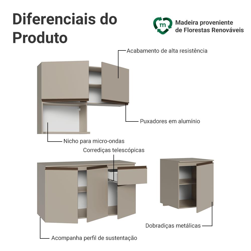 A Cozinha Compacta da linha Nice possui módulos essenciais para o dia a dia. Um dos grandes diferenciais dessa cozinha é o nicho aéreo, que oferece espaço para acomodar forno ou micro-ondas, otimizando ainda mais a organização do ambiente.A linha Nice chega em uma versão no tom crema, tonalidade que proporciona uma sensação de aconchego e leveza. Os puxadores em tom bronze metalizado são detalhes que valorizam o design. Além disso, os móveis podem ser instalados de forma suspensa, trazendo mais praticidade.Produzido com materiais de qualidade, o balcão conta com dobradiças metálicas nas portas e puxadores em perfil de alumínio, discretos e resistentes. As gavetas possuem corrediças que permitem abertura total. O tampo é removível, possibilitando a instalação de cuba ou pedra e o acabamento é de alta resistência, garantindo durabilidade no uso diário.Medidas totais:- 211 cm de altura- 180 cm de largura- 52 cm de profundidade nos balcões, 31 cm no aéreo e 45 cm no nicho de micro-ondasO que você recebe:- Um Armário Aéreo de 120 cm com duas portas- Um Nicho aéreo de 60 cm com espaço para forno- Um Balcão de 120 cm com três portas e uma gaveta- Um Balcão de 60 cm com uma portaCódigo do produto: GRNC1800037PÉ importante saber:- Material: MDP- O produto não possui pés, deve ser instalado de forma suspensa.- Imagens meramente ilustrativas, a decoração não acompanha o produto.- A Madesa não oferece serviço de montagem.- O produto segue com manual e todas as ferragens necessárias para a instalação.A Madesa se dedica à sustentabilidade com várias iniciativas: temos uma usina própria que gera energia para uma das fábricas. Priorizamos fornecedores responsáveis com o meio ambiente. Todo o plástico utilizado na produção é reciclado, e as sobras também são reaproveitadas. Investimos no desenvolvimento de nossos colaboradores e em ações que beneficiem a comunidade.