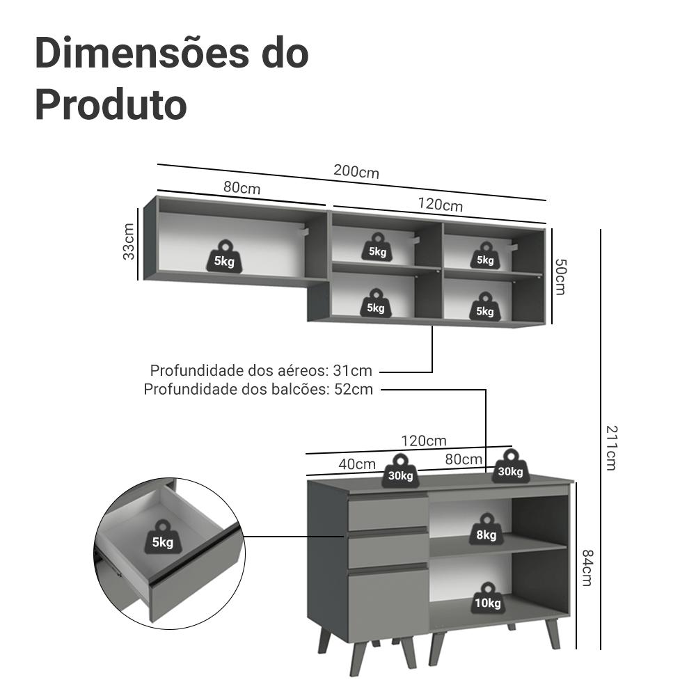 Renove sua cozinha com elegância e praticidade! Conheça o Armário de Cozinha Nice da Madesa.O ótimo espaço disponível permite armazenar louças, panelas, utensílios e eletroportáteis de maneira funcional, garantindo um ambiente sempre arrumado e eficiente.Fabricado com materiais de alta tecnologia, conta com dobradiças metálicas, corrediças telescópicas para abertura total das gavetas e puxadores de alumínio.Para completar, o acabamento cinza de alta resistência protege o móvel e segue tendências atuais de estilo.Medidas totais:- 211 cm de altura- 200 cm de largura- 52 cm de profundidade nos balcões e 31 cm nos aéreosO que você recebe:- Um (1) Aéreo de 80 cm com uma (1) porta basculante- Um (1) Aéreo de 120 cm com duas (2) portas- Um (1) Balcão de 40 cm com três (3) gavetas e tampo- Um (1) Balcão de 80 cm com duas (2) portas e tampo- Manual e ferragensCódigo do produto: GRNC2000063BÉ bom saber:- Imagens meramente ilustrativas- A Madesa não disponibiliza serviço de montagemA Madesa se dedica à sustentabilidade com várias iniciativas: temos uma usina própria para gerar energia que abastece uma de nossas fábricas. Selecionamos nossos fornecedores, priorizando aqueles que possuem um compromisso com a sustentabilidade e proteção do meio ambiente. Todo o plástico utilizado no setor produtivo é proveniente de reciclagem e as suas sobras são encaminhadas ao fornecedor que os recicla. Também investimos no desenvolvimento contínuo de nossos colaboradores e em ações educacionais que beneficiem a comunidade.
