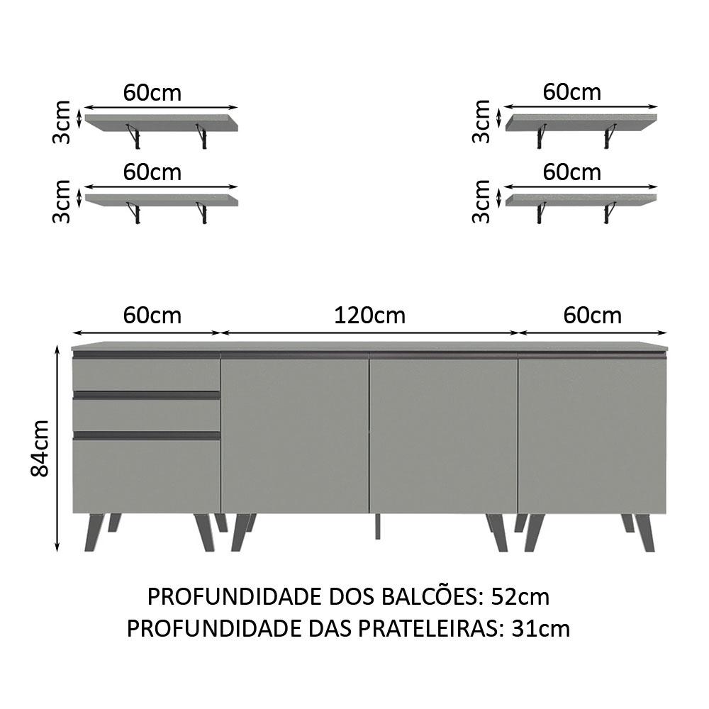 Um móvel moderno e pensado para ambientes compactos, que necessitam de total aproveitamento dos espaços. Confira todos os detalhes deste Armário de Cozinha da linha Nice da Madesa!Os materiais utilizados na construção são de alto padrão, pensados para proporcionar maior durabilidade e vida útil ao móvel. Conta com puxadores em alumínio na coloração titanium, corrediças telescópicas para abertura total das gavetas e dobradiças metálicas nas portas.Outro grande diferencial é que esta cozinha possui módulos avuslos, sendo possível distribuir as peças conforme a necessidade do seu espaço, se tornando uma cozinha planejada. Além disso, os balcões e as quatro prateleiras com mão francesa auxiliam na organização de utensílios, objetos decorativos, eletros e louças.Para completar, os balcões acompanham tampo, mas é possível fazer o recorte ou remoção para instalação de cooktop ou pia de inox ou pedra.O acabamento da cozinha é cinza, feito em Pintura Poliéster ecológica, que oferece proteção contra os efeitos da água e do calor.Medidas totais:- 240 cm de largura- 84 cm de altura- 52 cm de profundidadeItens inclusos:- Um (1) Balcão de 60 cm com três (3) gavetas e tampo- Um (1) Balcão de 120 cm com duas (2) portas e tampo- Um (1) Balcão de 60 cm com uma (1) porta e tampo- Quatro (4) Prateleiras suspensas com mão francesaCódigo do produto: GRNC2400013BObs.:- Imagens meramente ilustrativas- A Madesa não disponibiliza serviço de montagem- O produto segue com manual e todas as ferragens necessárias para a instalação1 – O produto vem montado? Se não, vocês realizam a montagem?R.: A Madesa não disponibiliza serviço de montagem. Todos os produtos seguem com manual de instalação e as ferragens necessárias. Alguns produtos possuem vídeo explicando o passo a passo da montagem.2 – Vocês possuem loja física? Posso retirar meu produto em mãos?R.: Não possuímos loja física, apenas loja virtual. Confira as opções de envio ao colocar o seu CEP.3 – Qual é o valor do envio? Posso pagar separadamente?R.: O valor do envio é calculado com base no peso e volume do produto, e no CEP de destino. Você pode calcular o valor e prazo de entrega no simulador.4 – A Madesa entrega em todo Brasil? Como é feita a entrega?R.: Sim, entregamos no Brasil inteiro através de transportadoras parceiras.5 – Os produtos possuem garantia?R.: Sim. A Madesa oferece 3 meses de garantia para defeitos de fabricação.A Madesa se dedica à sustentabilidade com várias iniciativas: temos uma usina própria para gerar energia que abastece uma de nossas fábricas. Selecionamos nossos fornecedores, priorizando aqueles que possuem um compromisso com a sustentabilidade e proteção do meio ambiente. Todo o plástico utilizado no setor produtivo é proveniente de reciclagem e as suas sobras são encaminhadas ao fornecedor que os recicla. Também investimos no desenvolvimento contínuo de nossos colaboradores e em ações educacionais que beneficiem a comunidade.