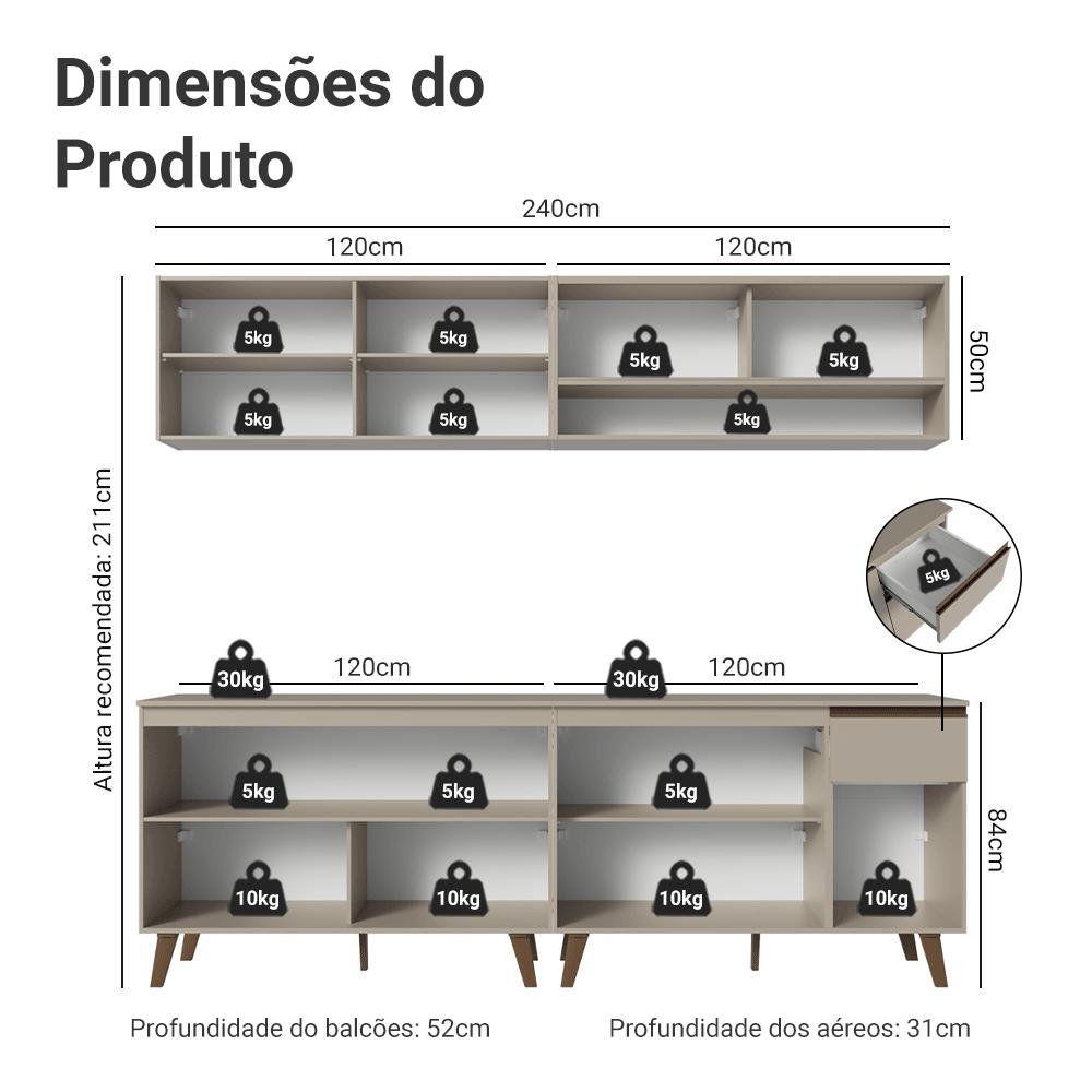 A Cozinha Completa de 240 cm é ideal para quem busca praticidade, estilo e bom aproveitamento de espaço. Seus principais diferenciais estão no armário aéreo com portas de vidro pontilhado, que adiciona um toque sofisticado ao ambiente.A linha Nice chega em uma nova versão no tom crema, uma tonalidade suave que transmite aconchego e leveza. Outro diferencial está nos puxadores em bronze metalizado e pés em bronze sólido, que acrescentam um toque contemporâneo.Produzido com materiais de qualidade, o balcão conta com dobradiças metálicas nas portas e puxadores em perfil de alumínio, discretos e resistentes. O tampo é removível, o que permite a instalação de cuba ou pedra. O acabamento é de alta resistência, garantindo durabilidade no uso diário.Medidas totais:- 211 cm de altura- 240 cm de largura- 52 cm de profundidade nos balcões e 31 cm nos aéreosO que você recebe: - Um Balcão de 120 cm com duas portas e tampo- Um Balcão de 120 cm com três portas, uma gaveta e tampo- Um Aéreo de 120 cm com duas portas- Um Aéreo de cm com duas portas de correr de vidro pontilhado e um nichoCódigo do produto: GRNC2400027PÉ importante saber:- Imagens meramente ilustrativas, a decoração não acompanha o produto.- A Madesa não oferece serviço de montagem.- O produto segue com manual e todas as ferragens necessárias para a instalação.A Madesa se dedica à sustentabilidade com várias iniciativas: temos usina própria que gera energia para uma das fábricas. Priorizamos fornecedores responsáveis com o meio ambiente. Todo o plástico utilizado na produção é reciclado, e as sobras também são reaproveitadas. Investimos no desenvolvimento de nossos colaboradores e em ações que beneficiem a comunidade.