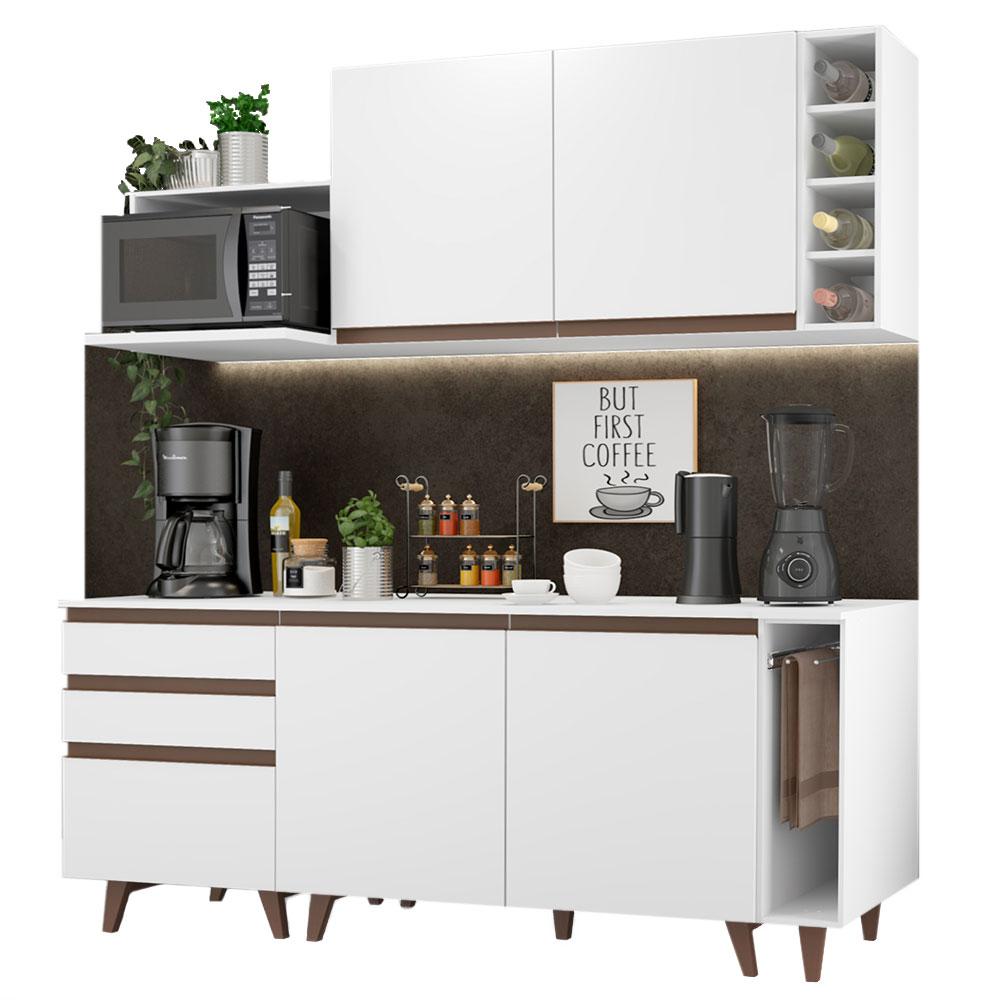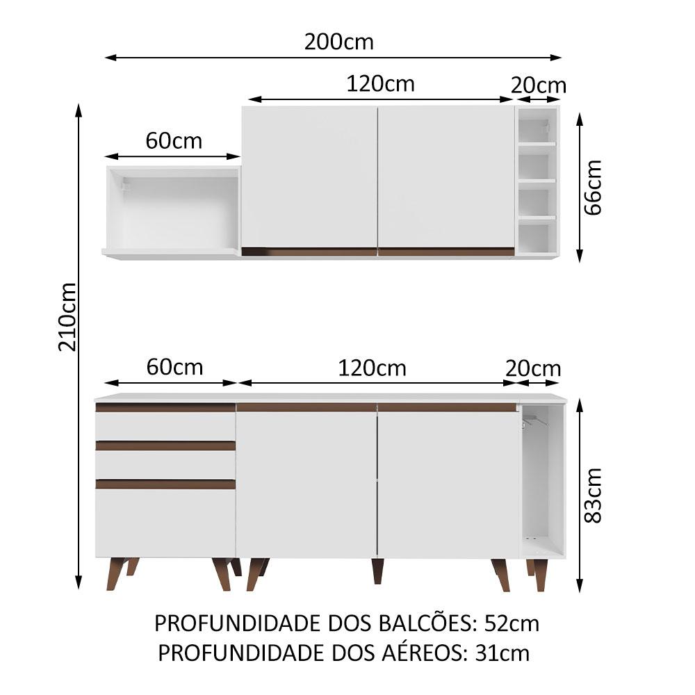A linha de Cozinhas Reims da Madesa é totalmente modulada e desenvolvida com base nas últimas tendências mundiais de design.Este modelo possui módulos avulsos, que podem ser organizados conforme a necessidade do ambiente. São fabricados com materiais de alto padrão, como corrediças e dobradiças metálicas e os puxadores são embutidos em alumínio.O espaço disponível é ideal para a organização de louça, panelas e utensílios. Além disso, todos os balcões acompanham tampos em MDP e o tampo do balcão maior pode ser removido para instalação de pia de inox ou pedra com espaço de 120 x 52 cm.Para completar, os pés em madeira maciça são muito bonitos e deixam seu móvel ainda mais firme e resistente.O acabamento branco é feito em Pintura Poliéster ecológica, que deixa o móvel mais resistente aos efeitos da água e do calor.Medidas totais:- 200 cm de largura- 210 cm de altura- 52 cm de profundidade nos balcões e 31 cm nos aéreosItens inclusos:- Um (1) Nicho aéreo de 60 cm com espaço para forno- Um (1) Balcão de 60 cm com três (3) gavetas e tampo- Um (1) Aéreo de 120 cm com duas (2) portas- Um (1) Balcão de 120 cm com duas (2) portas e tampo- Uma (1) Adega de 20 cm com (4) quatro nichos- Um (1) Balcão porta-panos de 20 cm com duas (2) hastes metálicas e tampoCódigo do produto: GRRM20000109Obs.:- A Madesa não disponibiliza serviço de montagem- O produto segue com manual de instalação e todas as ferragens necessárias para sua montagem- Imagens meramente ilustrativas, os eletros e as decorações não acompanham o produto1 – O produto é novo ou usado?R.: Todos os produtos da Madesa são novos, enviados da nossa fábrica diretamente para as casas de nossos clientes.2 – O produto vem montado? Se não, vocês realizam a montagem?R.: A Madesa não disponibiliza serviço de montagem. Todos os produtos seguem com manual de instalação e as ferragens necessárias. Alguns produtos possuem vídeo explicando o passo a passo da montagem.3 – Vocês possuem loja física? Posso retirar meu produto em mãos?R.: Não possuímos loja física, apenas loja virtual. Confira as opções de envio ao colocar o seu CEP.4 – Qual é o valor do envio? Posso pagar separadamente?R.: O valor do envio é calculado com base no peso e volume do produto, e no CEP de destino. Você pode calcular o valor e prazo de entrega no simulador.5 – A Madesa entrega em todo Brasil? Como é feita a entrega?R.: Sim, entregamos no Brasil inteiro através de transportadoras parceiras.6 – O produto acompanha Nota Fiscal?R.: Sim, todos os produtos são entregues com suas respectivas notas fiscais.7 – Os produtos possuem garantia?R.: Sim. A Madesa oferece 3 meses de garantia para defeitos de fabricação.A Madesa se dedica à sustentabilidade com várias iniciativas: temos uma usina própria para gerar energia que abastece uma de nossas fábricas. Selecionamos nossos fornecedores, priorizando aqueles que possuem um compromisso com a sustentabilidade e proteção do meio ambiente. Todo o plástico utilizado no setor produtivo é proveniente de reciclagem e as suas sobras são encaminhadas ao fornecedor que os recicla. Também investimos no desenvolvimento contínuo de nossos colaboradores e em ações educacionais que beneficiem a comunidade.