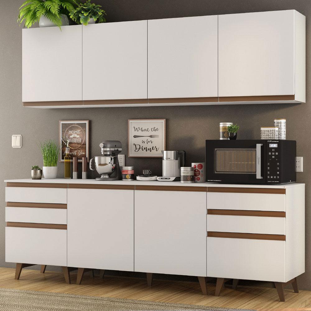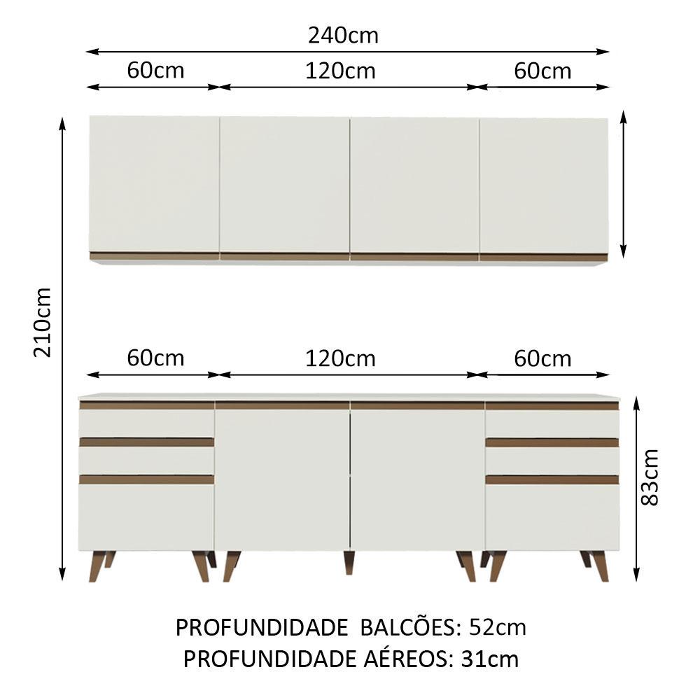 Moderna e aconchegante, a linha de Cozinhas Reims da Madesa foi desenvolvida levando em conta as últimas tendências mundiais de design.É fabricada com materiais de alto padrão, como corrediças e dobradiças metálicas. Os puxadores são embutidos, em alumínio na coloração marrom. Os pés em madeira são um charme a parte que além de beleza, conferem firmeza e resistência ao móvel.Para completar, os módulos são avulsos, o que permite a montagem conforme a necessidade do ambiente. Além disso, todos os balcões acompanham tampo, e o do balcão maior pode ser removido para colocação de pia com espaço de 120 x 52 cm.O acabamento da cozinha é branco e os pés são em amadeirado Rustic. O processo é feito em Pintura Poliéster ecológica de alta resistência, que dá maior destaque à tonalidade e conserva a beleza do móvel por mais tempo.As medidas totais são: 240 cm de largura e 210 cm de altura. A profundidade é de cozinha planejada: 52 cm nos balcões e 31 cm nos aéreos.(Imagens meramente ilustrativas: os eletros e as decorações não acompanham o produto.)Itens inclusos:- Dois (2) Aéreos de 60 cm com duas (2) portas- Dois (2) Balcões de 60 cm com três (3) gavetas e tampo- Um (1) Aéreo de 120 cm com duas (2) portas- Um (1) Balcão de 120 cm com duas (2) portasCódigo do produto: GRRM2400029BObs.: A Madesa não disponibiliza serviço de montagem. O produto segue com manual de instalação e todas as ferragens necessárias para sua montagem.1-O produto é novo ou usado?R.: Todos os produtos da Madesa são novos, enviados da nossa fábrica diretamente para as casas de nossos clientes.2-O produto vem montado? Se não, vocês realizam a montagem?R.: A Madesa não disponibiliza serviço de montagem. Todos os produtos seguem com manual de instalação e as ferragens necessárias. Alguns produtos possuem vídeo explicando o passo a passo da montagem.3-Vocês possuem loja física? Posso retirar meu produto em mãos?R.: Não possuímos loja física, apenas loja virtual. Confira as opções de envio ao colocar o seu CEP.4-Qual é o valor do envio? Posso pagar separadamente?R.: O valor do envio é calculado com base no peso e volume do produto, e no CEP de destino. Você pode calcular o valor e prazo de entrega no simulador.5-A Madesa entrega em todo Brasil? Como é feita a entrega?R.: Sim, entregamos no Brasil inteiro através de transportadoras parceiras.6-O produto acompanha Nota Fiscal?R.: Sim, todos os produtos são entregues com suas respectivas notas fiscais.7-Os produtos possuem garantia?R.: Sim. A Madesa oferece 3 meses de garantia para defeitos de fabricação.A Madesa se dedica à sustentabilidade com várias iniciativas: temos uma usina própria para gerar energia que abastece uma de nossas fábricas. Selecionamos nossos fornecedores, priorizando aqueles que possuem um compromisso com a sustentabilidade e proteção do meio ambiente. Todo o plástico utilizado no setor produtivo é proveniente de reciclagem e as suas sobras são encaminhadas ao fornecedor que os recicla. Também investimos no desenvolvimento contínuo de nossos colaboradores e em ações educacionais que beneficiem a comunidade.