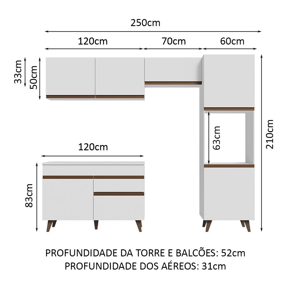 Um cantinho especial como a cozinha merece um móvel bonito, moderno e de qualidade, não é mesmo? Esta Cozinha Completa da linha Reims da Madesa vai fazer você amar a sua casa!Espaço não vai faltar, pois esta modulação possui balcão, torre e armários aéreos, que oferecem lugar de sobra para a organização de panelas, utensílios, louças, forno, micro-ondas e o que mais você preferir.O balcão desta cozinha acompanha tampo em MDP, que também pode ser removido caso você queira fazer a instalação de pia de inox ou pedra. Para isso, o espaço é de 120 x 52 cm.A qualidade dos materiais e componentes é um dos grandes destaques, pois proporcionam muita durabilidade ao produto. São corrediças e dobradiças metálicas, puxadores embutidos em alumínio e pés em madeira, mais firmes e resistentes.Para completar, esta cozinha é totalmente planejada. Ou seja, você pode organizar as peças conforme a necessidade do seu espaço.O acabamento da cozinha é branco, feito em Pintura Poliéster ecológica de alta resistência, que dá maior destaque à tonalidade e conserva a beleza do móvel por mais tempo.Medidas totais:- 250 cm de largura- 210 cm de altura- 52 cm de profundidade no balcão e na torre e 31 cm nos aéreosItens inclusos:- Um (1) Aéreo de 120 cm com duas (2) portas- Um (1) Aéreo de 70 cm com uma (1) porta basculante- Um (1) Balcão de 120 cm com duas (2) portas sendo uma delas basculante, uma (1) gaveta e tampo- Uma (1) Torre Quente de 60 cm com duas (2) portas e nicho para fornoCódigo do produto: GRRM25000609Obs.:- A Madesa não disponibiliza serviço de montagem- O produto segue com manual e todas as ferragens necessárias para a instalação- Por segurança, é obrigatória a fixação da torre na parede1 – O produto vem montado? Se não, vocês realizam a montagem?R.: A Madesa não disponibiliza serviço de montagem. Todos os produtos seguem com manual de instalação e as ferragens necessárias. Alguns produtos possuem vídeo explicando o passo a passo da montagem.2 – Vocês possuem loja física? Posso retirar meu produto em mãos?R.: Não possuímos loja física, apenas loja virtual. Confira as opções de envio ao colocar o seu CEP.3 – Qual é o valor do envio? Posso pagar separadamente?R.: O valor do envio é calculado com base no peso e volume do produto, e no CEP de destino. Você pode calcular o valor e prazo de entrega no simulador.4 – A Madesa entrega em todo Brasil? Como é feita a entrega?R.: Sim, entregamos no Brasil inteiro através de transportadoras parceiras.5 – Os produtos possuem garantia?R.: Sim. A Madesa oferece 3 meses de garantia para defeitos de fabricação.A Madesa se dedica à sustentabilidade com várias iniciativas: temos uma usina própria para gerar energia que abastece uma de nossas fábricas. Selecionamos nossos fornecedores, priorizando aqueles que possuem um compromisso com a sustentabilidade e proteção do meio ambiente. Todo o plástico utilizado no setor produtivo é proveniente de reciclagem e as suas sobras são encaminhadas ao fornecedor que os recicla. Também investimos no desenvolvimento contínuo de nossos colaboradores e em ações educacionais que beneficiem a comunidade.