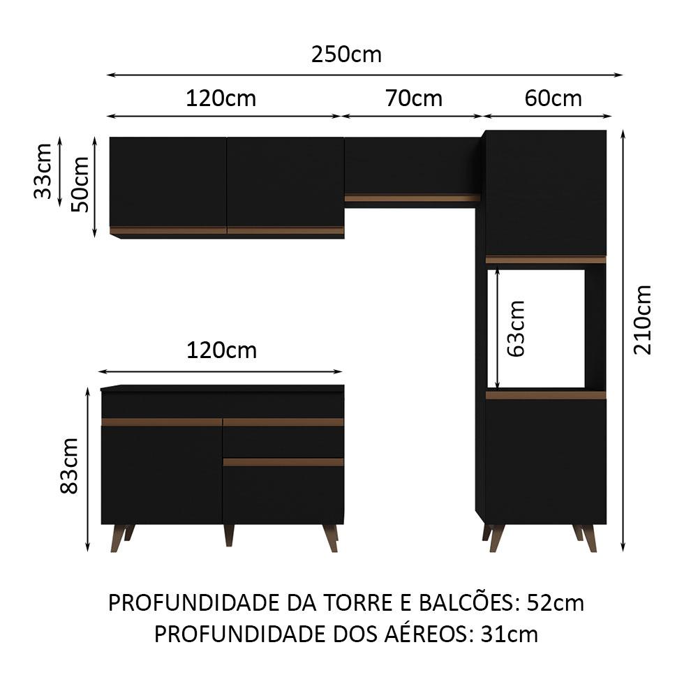 Um cantinho especial como a cozinha merece um móvel bonito, moderno e de qualidade, não é mesmo? Esta Cozinha Completa da linha Reims da Madesa vai fazer você amar a sua casa!Espaço não vai faltar, pois esta modulação possui balcão, torre e armários aéreos, que oferecem lugar de sobra para a organização de panelas, utensílios, louças, forno, micro-ondas e o que mais você preferir.O balcão desta cozinha acompanha tampo em MDP, que também pode ser removido caso você queira fazer a instalação de pia de inox ou pedra. Para isso, o espaço é de 120 x 52 cm.A qualidade dos materiais e componentes é um dos grandes destaques, pois proporcionam muita durabilidade ao produto. São corrediças e dobradiças metálicas, puxadores embutidos em alumínio e pés em madeira, mais firmes e resistentes.Para completar, esta cozinha é totalmente planejada. Ou seja, você pode organizar as peças conforme a necessidade do seu espaço.O acabamento da cozinha é preto, feito em Pintura Poliéster ecológica de alta resistência, que dá maior destaque à tonalidade e conserva a beleza do móvel por mais tempo.Medidas totais:- 250 cm de largura- 210 cm de altura- 52 cm de profundidade no balcão e na torre e 31 cm nos aéreosItens inclusos:- Um (1) Aéreo de 120 cm com duas (2) portas- Um (1) Aéreo de 70 cm com uma (1) porta basculante- Um (1) Balcão de 120 cm com duas (2) portas sendo uma delas basculante, uma (1) gaveta e tampo- Uma (1) Torre Quente de 60 cm com duas (2) portas e nicho para fornoCódigo do produto: GRRM25000568NObs.:- A Madesa não disponibiliza serviço de montagem- O produto segue com manual e todas as ferragens necessárias para a instalação- Por segurança, é obrigatória a fixação da torre na parede1 – O produto vem montado? Se não, vocês realizam a montagem?R.: A Madesa não disponibiliza serviço de montagem. Todos os produtos seguem com manual de instalação e as ferragens necessárias. Alguns produtos possuem vídeo explicando o passo a passo da montagem.2 – Vocês possuem loja física? Posso retirar meu produto em mãos?R.: Não possuímos loja física, apenas loja virtual. Confira as opções de envio ao colocar o seu CEP.3 – Qual é o valor do envio? Posso pagar separadamente?R.: O valor do envio é calculado com base no peso e volume do produto, e no CEP de destino. Você pode calcular o valor e prazo de entrega no simulador.4 – A Madesa entrega em todo Brasil? Como é feita a entrega?R.: Sim, entregamos no Brasil inteiro através de transportadoras parceiras.5 – Os produtos possuem garantia?R.: Sim. A Madesa oferece 3 meses de garantia para defeitos de fabricação.A Madesa se dedica à sustentabilidade com várias iniciativas: temos uma usina própria para gerar energia que abastece uma de nossas fábricas. Selecionamos nossos fornecedores, priorizando aqueles que possuem um compromisso com a sustentabilidade e proteção do meio ambiente. Todo o plástico utilizado no setor produtivo é proveniente de reciclagem e as suas sobras são encaminhadas ao fornecedor que os recicla. Também investimos no desenvolvimento contínuo de nossos colaboradores e em ações educacionais que beneficiem a comunidade.