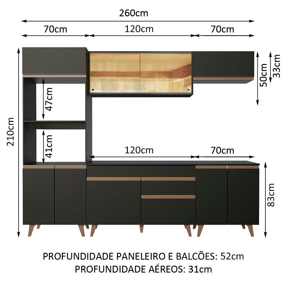 A linha de Cozinhas Reims da Madesa contempla opções modernas e sofisticadas, desenvolvidas com base nas últimas tendências mundiais de design.A cozinha é fabricada com materiais de padrão superior, como corrediças e dobradiças metálicas. Os puxadores são embutidos, em alumínio na coloração marrom. Os módulos avulsos permitem a montagem conforme a necessidade do ambiente e os pés em madeira são um charme a parte que além de beleza, conferem firmeza e resistência ao móvel.Para agregar ainda mais beleza e elegância, este modelo possui um armário aéreo com duas portas de correr de vidro reflex, que podem refletir o espaço ou mostrar o interior do móvel, variando conforme a luz do ambiente.Para completar, ambos os balcões acompanham tampos. O do balcão maior pode ser removido para colocação de pia com espaço de 120 x 52 cm. O tampo do balcão menor pode ser recortado para instalação de cooktop.O acabamento da cozinha é preto, com exceção da parte interna das gavetas e das costas são brancas. O processo é feito em Pintura Poliéster ecológica de alta resistência, que dá maior destaque à tonalidade e conserva a beleza do móvel por mais tempo.As medidas totais são: 260 cm de largura e 210 cm de altura. A profundidade é de cozinha planejada: 52 cm nos balcões e na torre e 31 cm nos aéreos.(Imagens meramente ilustrativas: os eletros e as decorações não acompanham o produto. Por segurança, é obrigatória a fixação da torre quente na parede.)Itens inclusos:- Uma (1) Torre quente de 70 cm com três (3) portas, sendo uma delas basculante- Um (1) Aéreo de 120 cm com duas (2) portas de correr de vidro reflex- Um (1) Balcão de 120 cm com duas (2) portas sendo uma delas basculante, uma (1) gaveta e tampo- Um (1) Aéreo de 70 cm com uma (1) porta basculante- Um (1) Balcão de 70 cm com duas (2) portas e tampoCódigo do produto: GRRM2600028NObs.: A Madesa não disponibiliza serviço de montagem. O produto segue com manual de instalação e todas as ferragens necessárias para sua montagem.1 – O produto é novo ou usado?R.: Todos os produtos da Madesa são novos, enviados da nossa fábrica diretamente para as casas de nossos clientes.2 – O produto vem montado? Se não, vocês realizam a montagem?R.: A Madesa não disponibiliza serviço de montagem. Todos os produtos seguem com manual de instalação e as ferragens necessárias. Alguns produtos possuem vídeo explicando o passo a passo da montagem.3 – Vocês possuem loja física? Posso retirar meu produto em mãos?R.: Não possuímos loja física, apenas loja virtual. Confira as opções de envio ao colocar o seu CEP.4 – Qual é o valor do envio? Posso pagar separadamente?R.: O valor do envio é calculado com base no peso e volume do produto, e no CEP de destino. Você pode calcular o valor e prazo de entrega no simulador.5 – A Madesa entrega em todo Brasil? Como é feita a entrega?R.: Sim, entregamos no Brasil inteiro através de transportadoras parceiras.6 – O produto acompanha Nota Fiscal?R.: Sim, todos os produtos são entregues com suas respectivas notas fiscais.7 – Os produtos possuem garantia?R.: Sim. A Madesa oferece 3 meses de garantia para defeitos de fabricação.A Madesa se dedica à sustentabilidade com várias iniciativas: temos uma usina própria para gerar energia que abastece uma de nossas fábricas. Selecionamos nossos fornecedores, priorizando aqueles que possuem um compromisso com a sustentabilidade e proteção do meio ambiente. Todo o plástico utilizado no setor produtivo é proveniente de reciclagem e as suas sobras são encaminhadas ao fornecedor que os recicla. Também investimos no desenvolvimento contínuo de nossos colaboradores e em ações educacionais que beneficiem a comunidade.