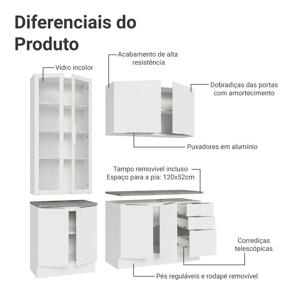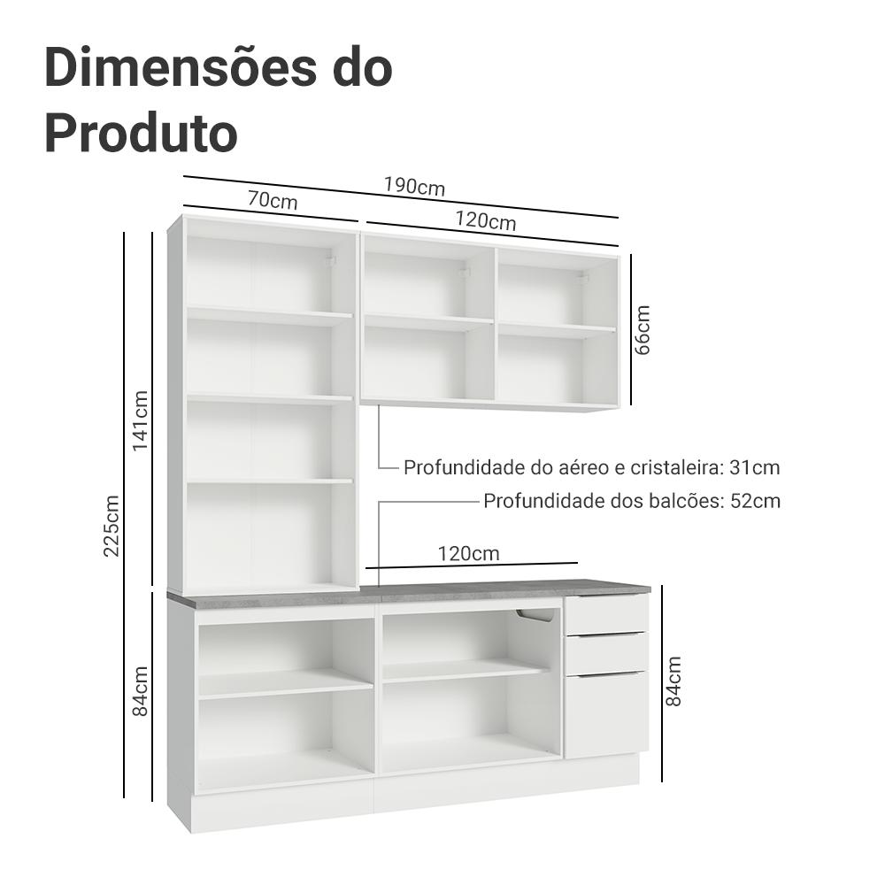 Para renovar sua cozinha com beleza e modernidade, confira este Armário de Cozinha Compacta da linha Stella da Madesa.Composto por itens de muita qualidade, possui puxadores slim em alumínio, gavetas com corrediças telescópicas de abertura total, portas com amortecimento para fechamento suave e pés reguláveis em PVC.O grande diferencial deste modelo fica por conta da cristaleira. Super sofisticada, possui duas portas de vidro e muito espaço disponível para organizar louças, copos e demais objetos.A cozinha ainda conta com diversas gavetas, prateleiras e nichos. Assim, fica mais fácil fazer a organização de todos os utensílios. Além disso, o balcão acompanha tampo, que pode ser removido para instalação de pia de inox ou pedra, nas medidas de 120 x 52 cm.Esta cozinha é planejada, composta por módulos avulsos que podem ser organizados conforme o espaço do seu ambiente. Também pode ser posteriormente complementada pelos módulos da linha Stella da Madesa.E para completar, o acabamento do móvel é branco.Medidas totais:- 225 cm de altura- 190 cm de largura- 52 cm de profundidade nos balcões e 31 cm no aéreo e na cristaleiraItens inclusos:- Uma (1) Cristaleira de 70 cm com duas (2) portas- Um (1) Balcão de 70 cm com duas (2) portas e tampo- Um (1) Aéreo de 120 cm com duas (2) portas- Um (1) Balcão de 120 cm com duas (2) portas, três (3) gavetas e tampoCódigo do produto: GRTE19000309Obs.:- A cristaleira não acompanha pés nem kit para suspender na parede. Deve ser instalada sobre o balcão e fixada na parede.- As imagens são meramente ilustrativas, os eletros e a decoração não acompanham o produto
