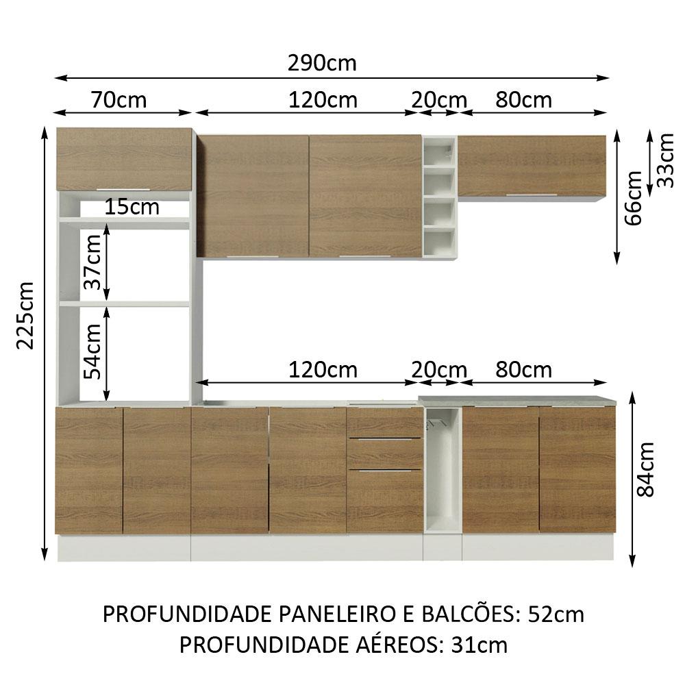 Uma linha totalmente modulada, fabricada com itens de alto padrão e design atual. Conheça as cozinhas Stella da Madesa.Entre as principais características da linha estão os puxadores em alumínio no modelo slim, as gavetas com corrediças telescópicas de abertura total e as portas com amortecimento para fechamento suave. Todos estes diferenciais agregam valor, pois prolongam a vida útil do móvel.O espaço para organização dos utensílios da cozinha é ótimo. A torre quente possui nichos para dois fornos e fundo aberto com saída para o calor. Também permite a instalação de forno embutido. O balcão maior tem espaço para pia de 120 x 52 cm e não acompanha tampo. O balcão de 80 cm possui tampo que pode ser recortado para instalação de cooktop. Para completar, a cozinha contempla adega e balcão porta-pano.Outro diferencial são os pés reguláveis em PVC com rodapé removível de MDP de encaixe fácil. Este detalhe facilita muito a limpeza.As medidas totais são: 290 cm de largura e 225 cm de altura. Profundidade de 52 cm nos balcões na torre e 31 cm nos aéreos.O acabamento da estrutura é branco e as portas e frentes são no padrão amadeirado Rustic. O processo é feito com a Pintura Poliéster exclusiva e patenteada da Madesa. Um método que não agride o meio ambiente e protege o móvel dos efeitos da água e do calor.Esta cozinha pode ser complementada pelos módulos avulsos da linha Stella da Madesa.(As imagens são meramente ilustrativas: a decoração não acompanha o produto.)Itens inclusos:- Uma (1) Torre quente com dois (2) nichos para forno e micro-ondas, um (1) nicho menor e três (3) portas, sendo uma (1) basculante- Um (1) Balcão de pia com duas (2) portas, três (3) gavetas e um (1) porta-talheres- Um (1) Balcão porta-panos com duas (2) hastes metálicas e tampo de MDP em pintura Mood- Um (1) Balcão com duas (2) portas e tampo de MDP em pintura Mood- Um (1) Aéreo com duas (2) portas- Uma (1) Adega com quatro (4) nichos abertos- Um (1) Aéreo com uma (1) porta basculanteCódigo do produto: GRTE2900019BObs.: A Madesa não disponibiliza serviço de montagem. O produto segue com manual de instalação e todas as ferragens necessárias para sua montagem.1 – O produto é novo ou usado?R.: Todos os produtos da Madesa são novos, enviados da nossa fábrica diretamente para as casas de nossos clientes.2 – O produto vem montado? Se não, vocês realizam a montagem?R.: A Madesa não disponibiliza serviço de montagem. Todos os produtos seguem com manual de instalação e as ferragens necessárias. Alguns produtos possuem vídeo explicando o passo a passo da montagem.3 – Vocês possuem loja física? Posso retirar meu produto em mãos?R.: Não possuímos loja física, apenas loja virtual. Confira as opções de envio ao colocar o seu CEP.4 – Qual é o valor do envio? Posso pagar separadamente?R.: O valor do envio é calculado com base no peso e volume do produto, e no CEP de destino. Você pode calcular o valor e prazo de entrega no simulador.5 – A Madesa entrega em todo Brasil? Como é feita a entrega?R.: Sim, entregamos no Brasil inteiro através de transportadoras parceiras.A Madesa se dedica à sustentabilidade com várias iniciativas: temos uma usina própria para gerar energia que abastece uma de nossas fábricas. Selecionamos nossos fornecedores, priorizando aqueles que possuem um compromisso com a sustentabilidade e proteção do meio ambiente. Todo o plástico utilizado no setor produtivo é proveniente de reciclagem e as suas sobras são encaminhadas ao fornecedor que os recicla. Também investimos no desenvolvimento contínuo de nossos colaboradores e em ações educacionais que beneficiem a comunidade.