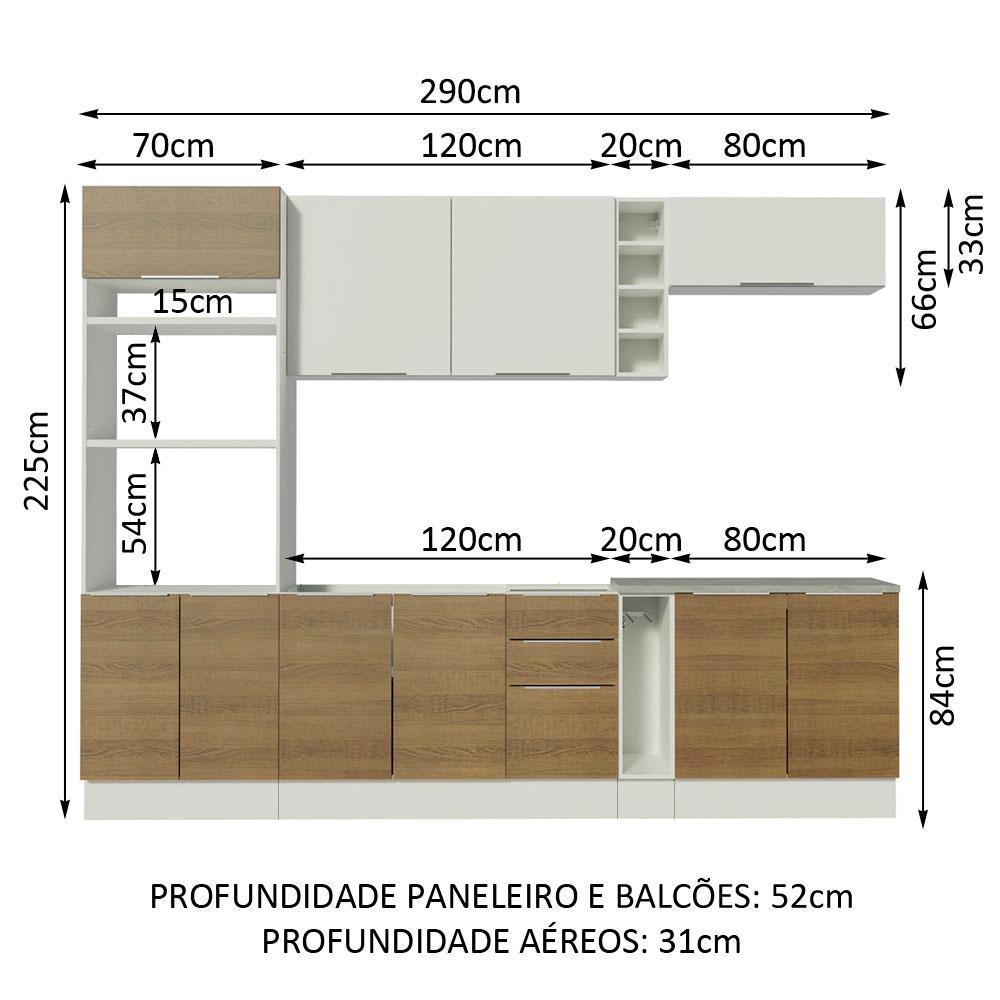 Uma linha totalmente modulada, fabricada com itens de alto padrão e design atual. Conheça as cozinhas Stella da Madesa.Entre as principais características da linha estão os puxadores em alumínio no modelo slim, as gavetas com corrediças telescópicas de abertura total e as portas com amortecimento para fechamento suave. Todos estes diferenciais agregam valor, pois prolongam a vida útil do móvel.O espaço para organização dos utensílios da cozinha é ótimo. A torre quente possui nichos para dois fornos e fundo aberto com saída para o calor. O balcão maior tem espaço para pia de 120 x 52 cm e não acompanha tampo. O balcão de 80 cm possui tampo que pode ser recortado para instalação de cooktop. Para completar, a cozinha contempla adega e balcão porta-pano.Outro diferencial são os pés reguláveis em PVC com rodapé removível de MDP de encaixe fácil. Este detalhe facilita muito a limpeza. Além disso, a torre possui espaço para forno e micro-ondas e permite a instalação de forno embutido.As medidas totais são: 290 cm de largura e 225 cm de altura. Profundidade de 52 cm nos balcões na torre e 31 cm nos aéreos.O acabamento combina os tons branco e amadeirado Rustic. O processo é feito com a Pintura Poliéster exclusiva e patenteada da Madesa. Um método que não agride o meio ambiente e protege o móvel dos efeitos da água e do calor.Esta cozinha pode ser complementada pelos módulos avulsos da linha Stella da Madesa.(As imagens são meramente ilustrativas: a decoração não acompanha o produto.)Itens inclusos:- Uma (1) Torre quente com dois (2) nichos para forno e micro-ondas, um (1) nicho menor e três (3) portas, sendo uma (1) basculante- Um (1) Balcão de pia com duas (2) portas, três (3) gavetas e um (1) porta-talheres- Um (1) Balcão porta-panos com duas (2) hastes metálicas e tampo de MDP em pintura Mood- Um (1) Balcão com duas (2) portas e tampo de MDP em pintura Mood- Um (1) Aéreo com duas (2) portas- Uma (1) Adega com quatro (4) nichos abertos- Um (1) Aéreo com uma (1) porta basculanteCódigo do produto: GRTE290001A8Obs.: A Madesa não disponibiliza serviço de montagem. O produto segue com manual de instalação e todas as ferragens necessárias para sua montagem.1 – O produto é novo ou usado?R.: Todos os produtos da Madesa são novos, enviados da nossa fábrica diretamente para as casas de nossos clientes.2 – O produto vem montado? Se não, vocês realizam a montagem?R.: A Madesa não disponibiliza serviço de montagem. Todos os produtos seguem com manual de instalação e as ferragens necessárias. Alguns produtos possuem vídeo explicando o passo a passo da montagem.3 – Vocês possuem loja física? Posso retirar meu produto em mãos?R.: Não possuímos loja física, apenas loja virtual. Confira as opções de envio ao colocar o seu CEP.4 – Qual é o valor do envio? Posso pagar separadamente?R.: O valor do envio é calculado com base no peso e volume do produto, e no CEP de destino. Você pode calcular o valor e prazo de entrega no simulador.5 – A Madesa entrega em todo Brasil? Como é feita a entrega?R.: Sim, entregamos no Brasil inteiro através de transportadoras parceiras.A Madesa se dedica à sustentabilidade com várias iniciativas: temos uma usina própria para gerar energia que abastece uma de nossas fábricas. Selecionamos nossos fornecedores, priorizando aqueles que possuem um compromisso com a sustentabilidade e proteção do meio ambiente. Todo o plástico utilizado no setor produtivo é proveniente de reciclagem e as suas sobras são encaminhadas ao fornecedor que os recicla. Também investimos no desenvolvimento contínuo de nossos colaboradores e em ações educacionais que beneficiem a comunidade.