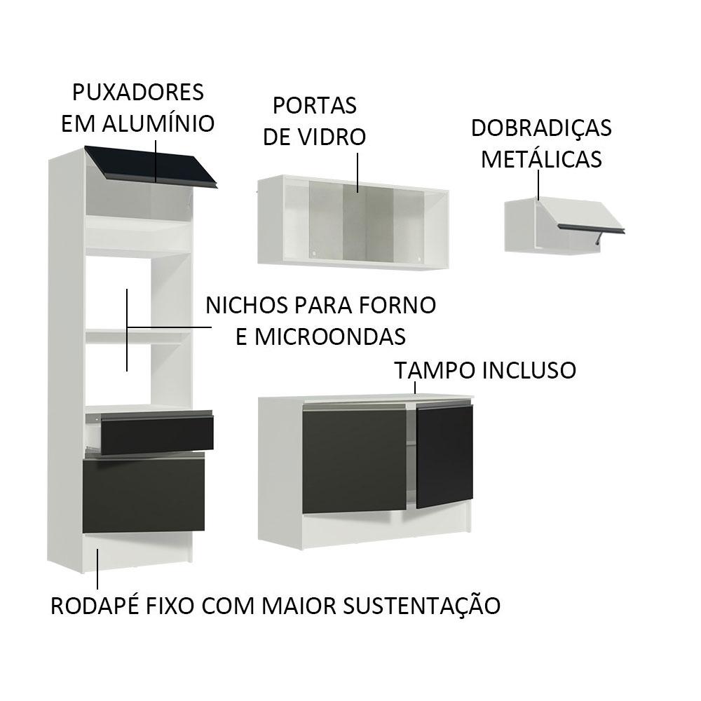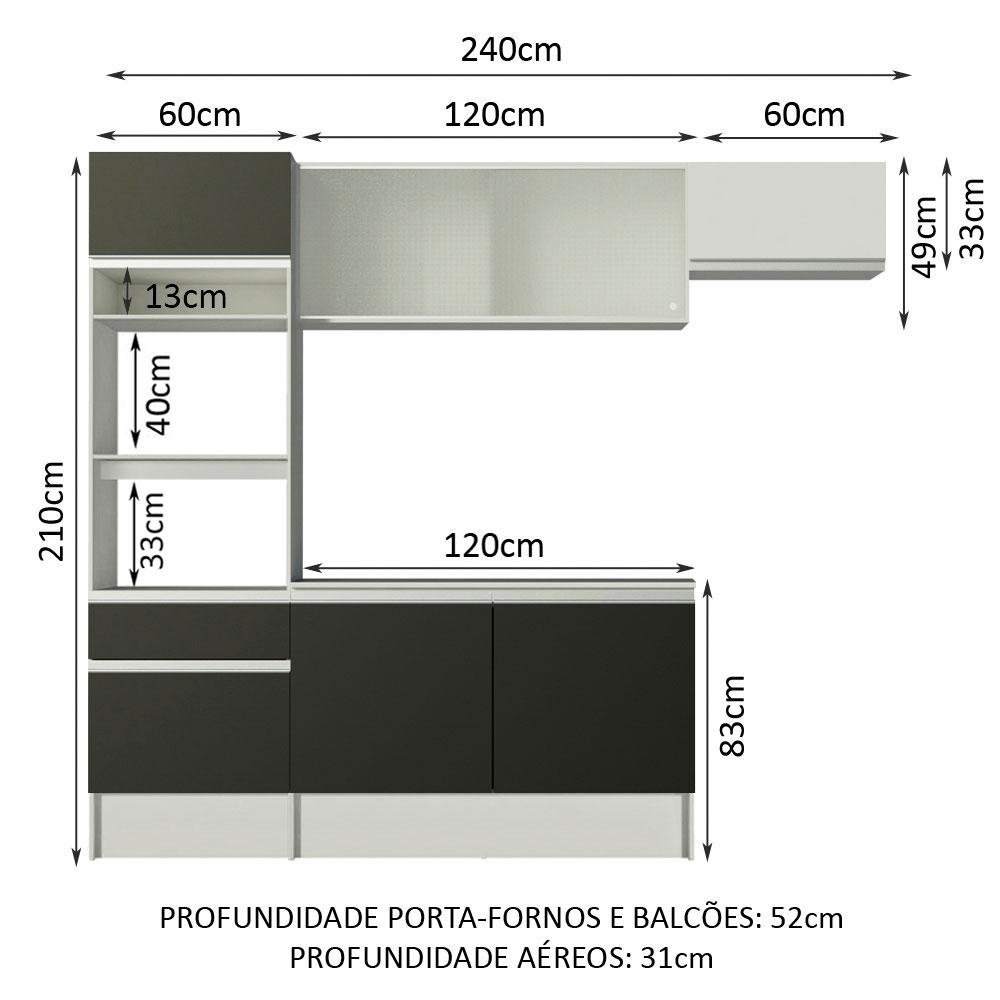 A Cozinha Completa Topazio da Madesa é totalmente versátil e combina com ambientes modernos, retrô ou coloridos. Conta com materiais de qualidade, como puxadores em perfil total de alumínio, dobradiças e corrediças metálicas. Além disso, o aéreo com portas de vidro agrega beleza e sofisticação.Contempla o tampo do balcão de pia que pode ser removido para a colocação de uma pia com as medidas de até 120 cm x 52 cm. O paneleiro e o balcão de pia são montados juntos conferindo maior estabilidade.O acabamento da estrutura interna e externa é branco. As portas e a frente da gaveta são pretas, com exceção da porta do aéreo de 60 cm, que é branca. O processo é feito em Poliéster Protetor ecológico, que consiste na aplicação de 7 camadas resistentes a álcool, água e calor.As medidas totais são: 240 cm de largura e 210 cm de altura; profundidades de 31 cm nos aéreos e 52 cm nos balcões e na torre.(As imagens são meramente ilustrativas. Os eletros e as decorações não acompanham o produto.)Itens inclusos:- Uma (1) torre com nichos para forno e micro-ondas, com uma (1) gaveta e duas (2) portas, sendo uma basculante- Um (1) balcão de 120 cm com duas (2) portas- Um (1) aéreo de 120 cm com portas deslizantes em vidro- Um (1) tampo de MDP branco para balcão de pia de 120 cm x 52 cm- Um (1) aéreo de 60 cm com porta basculanteCódigo do produto: GRTP240001C7Obs: A Madesa não disponibiliza serviço de montagem. O produto segue com manual de instalação e todas as ferragens necessárias para sua montagem.1-O produto é novo ou usado?R.: Todos os produtos da Madesa são novos, enviados da nossa fábrica diretamente para as casas de nossos clientes.2-O produto vem montado? Se não, vocês realizam a montagem?R.: A Madesa não disponibiliza serviço de montagem. Todos os produtos seguem com manual de instalação e as ferragens necessárias. Alguns produtos possuem vídeo explicando o passo a passo da montagem.3-Vocês possuem loja física? Posso retirar meu produto em mãos?R.: Não possuímos loja física, apenas loja virtual. Confira as opções de envio ao colocar o seu CEP.4-Qual é o valor do envio? Posso pagar separadamente?R.: O valor do envio é calculado com base no peso e volume do produto, e no CEP de destino. Você pode calcular o valor e prazo de entrega no simulador.5-A Madesa entrega em todo Brasil? Como é feita a entrega?R.: Sim, entregamos no Brasil inteiro através de transportadoras parceiras.6-O produto acompanha Nota Fiscal?R.: Sim, todos os produtos são entregues com suas respectivas notas fiscais.7-Os produtos possuem garantia?R.: Sim. A Madesa oferece 3 meses de garantia para defeitos de fabricação.A Madesa se dedica à sustentabilidade com várias iniciativas: temos uma usina própria para gerar energia que abastece uma de nossas fábricas. Selecionamos nossos fornecedores, priorizando aqueles que possuem um compromisso com a sustentabilidade e proteção do meio ambiente. Todo o plástico utilizado no setor produtivo é proveniente de reciclagem e as suas sobras são encaminhadas ao fornecedor que os recicla. Também investimos no desenvolvimento contínuo de nossos colaboradores e em ações educacionais que beneficiem a comunidade.