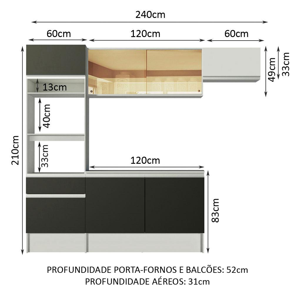 A Cozinha Completa Diamante da Madesa é totalmente versátil e combina com ambientes modernos, retrô ou coloridos. Conta com materiais de qualidade, como puxadores em perfil total de alumínio, dobradiças e corrediças metálicas.Seu aéreo em vidro reflex traz beleza e sofisticação ao ambiente, podendo revelar sutilmente o interior do móvel ou refletir o espaço, variando de acordo com a iluminação.Contempla o tampo do balcão de pia que pode ser removido para a colocação de uma pia com as medidas de até 120 cm x 52 cm. O paneleiro e o balcão de pia são montados juntos conferindo maior estabilidade.O acabamento da estrutura interna e externa é branco. As portas e a frente da gaveta são pretas, com exceção da porta do aéreo de 60 cm, que é branca. O processo é feito em Poliéster Protetor ecológico, que consiste na aplicação de 7 camadas resistentes a álcool, água e calor.As medidas totais são: 240 cm de largura e 210 cm de altura; profundidades de 31 cm nos aéreos e 52 cm no balcão e na torre.(As imagens são meramente ilustrativas. Os eletros e as decorações não acompanham o produto.)Itens inclusos:- Uma (1) torre com nichos para forno e micro-ondas, com uma (1) gaveta e duas (2) portas, sendo uma basculante- Um (1) balcão de 120 cm com duas (2) portas- Um (1) aéreo de 120 cm com portas deslizantes em vidro reflex- Um (1) tampo de MDP branco para balcão de pia de 120 cm x 52 cm- Um (1) aéreo de 60 cm com porta basculanteCódigo do produto: GRTP240002C7Obs: A Madesa não disponibiliza serviço de montagem. O produto segue com manual de instalação e todas as ferragens necessárias para sua montagem.1-O produto é novo ou usado?R.: Todos os produtos da Madesa são novos, enviados da nossa fábrica diretamente para as casas de nossos clientes.2-O produto vem montado? Se não, vocês realizam a montagem?R.: A Madesa não disponibiliza serviço de montagem. Todos os produtos seguem com manual de instalação e as ferragens necessárias. Alguns produtos possuem vídeo explicando o passo a passo da montagem.3-Vocês possuem loja física? Posso retirar meu produto em mãos?R.: Não possuímos loja física, apenas loja virtual. Confira as opções de envio ao colocar o seu CEP.4-Qual é o valor do envio? Posso pagar separadamente?R.: O valor do envio é calculado com base no peso e volume do produto, e no CEP de destino. Você pode calcular o valor e prazo de entrega no simulador.5-A Madesa entrega em todo Brasil? Como é feita a entrega?R.: Sim, entregamos no Brasil inteiro através de transportadoras parceiras.6-O produto acompanha Nota Fiscal?R.: Sim, todos os produtos são entregues com suas respectivas notas fiscais.7-Os produtos possuem garantia?R.: Sim. A Madesa oferece 3 meses de garantia para defeitos de fabricação.A Madesa se dedica à sustentabilidade com várias iniciativas: temos uma usina própria para gerar energia que abastece uma de nossas fábricas. Selecionamos nossos fornecedores, priorizando aqueles que possuem um compromisso com a sustentabilidade e proteção do meio ambiente. Todo o plástico utilizado no setor produtivo é proveniente de reciclagem e as suas sobras são encaminhadas ao fornecedor que os recicla. Também investimos no desenvolvimento contínuo de nossos colaboradores e em ações educacionais que beneficiem a comunidade.