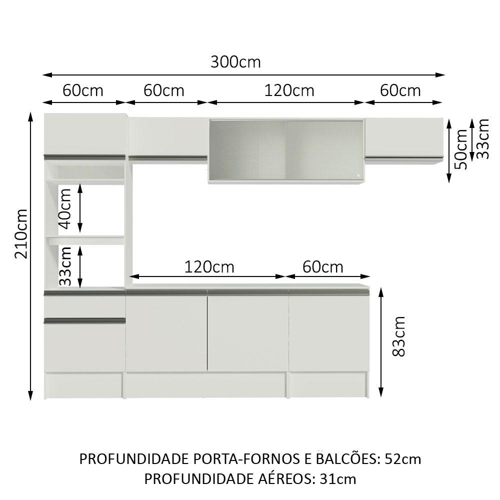 Esta Cozinha Completa da linha Topazio da Madesa é muito versátil e combina com os mais variados ambientes.É fabricada com materiais de qualidade, como puxadores em perfil total de alumínio, dobradiças e corrediças metálicas. Além disso, os vidros no armário aéreo deixam sua cozinha muito mais elegante e sofisticada.Este modelo contempla o tampo do balcão de pia, que pode ser removido para a colocação de uma pia com as medidas de até 120 cm x 52 cm. Já o balcão menor possui 60 cm x 52 cm e segue com tampo que pode ser recortado para a colocação do cooktop.Para completar, a torre-quente possui espaço para forno e micro-ondas. Também permite a instalação de forno embutido.O acabamento da cozinha é branco, feito em Poliéster Protetor ecológico, que consiste na aplicação de 7 camadas resistentes a álcool, água e calor.As medidas totais são: 300 cm de largura e 210 cm de altura; profundidades de 31 cm nos aéreos e 52 cm nos balcões e na torre.(As imagens são meramente ilustrativas. Os eletros e as decorações não acompanham o produto.)Itens inclusos:- Uma (1) Torre com dois (2) nichos para fornos, uma (1) gaveta, duas (2) portas- Um (1) balcão de 120 cm com duas (2) portas e tampo- Um (1) Aéreo de 120 cm com portas deslizantes em vidro- Um (1) Balcão de 60 cm com uma (1) porta e tampo- Dois (2) Aéreos de 60 cm com porta basculanteCódigo do produto: GRTP30000109Obs: A Madesa não disponibiliza serviço de montagem. O produto segue com manual e todas as ferragens necessárias para a instalação.1 – O produto é novo ou usado?R.: Todos os produtos da Madesa são novos, enviados da nossa fábrica diretamente para as casas de nossos clientes.2 – O produto vem montado? Se não, vocês realizam a montagem?R.: A Madesa não disponibiliza serviço de montagem. Todos os produtos seguem com manual de instalação e as ferragens necessárias. Alguns produtos possuem vídeo explicando o passo a passo da montagem.3 – Vocês possuem loja física? Posso retirar meu produto em mãos?R.: Não possuímos loja física, apenas loja virtual. Confira as opções de envio ao colocar o seu CEP.4 – Qual é o valor do envio? Posso pagar separadamente?R.: O valor do envio é calculado com base no peso e volume do produto, e no CEP de destino. Você pode calcular o valor e prazo de entrega no simulador.5 – A Madesa entrega em todo Brasil? Como é feita a entrega?R.: Sim, entregamos no Brasil inteiro através de transportadoras parceiras.6 – O produto acompanha Nota Fiscal?R.: Sim, todos os produtos são entregues com suas respectivas notas fiscais.7 – Os produtos possuem garantia?R.: Sim. A Madesa oferece 3 meses de garantia para defeitos de fabricação.A Madesa se dedica à sustentabilidade com várias iniciativas: temos uma usina própria para gerar energia que abastece uma de nossas fábricas. Selecionamos nossos fornecedores, priorizando aqueles que possuem um compromisso com a sustentabilidade e proteção do meio ambiente. Todo o plástico utilizado no setor produtivo é proveniente de reciclagem e as suas sobras são encaminhadas ao fornecedor que os recicla. Também investimos no desenvolvimento contínuo de nossos colaboradores e em ações educacionais que beneficiem a comunidade.