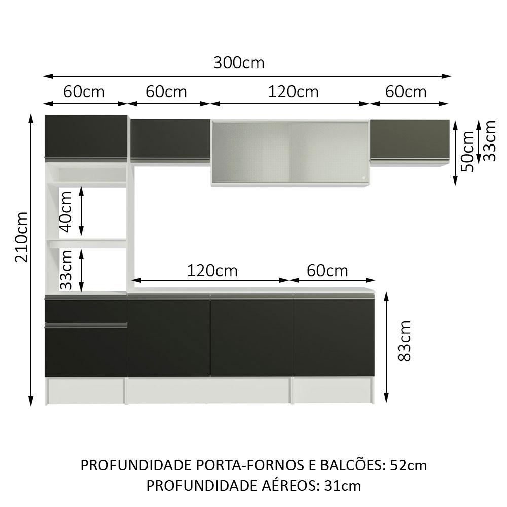 Esta Cozinha Completa da linha Topazio da Madesa é muito versátil e combina com os mais variados ambientes.É fabricada com materiais de qualidade, como puxadores em perfil total de alumínio, dobradiças e corrediças metálicas. Além disso, os vidros no armário aéreo deixam sua cozinha muito mais elegante e sofisticada.Este modelo contempla o tampo do balcão de pia, que pode ser removido para a colocação de uma pia com as medidas de até 120 cm x 52 cm. Já o balcão menor possui 60 cm x 52 cm e segue com tampo que pode ser recortado para a colocação do cooktop. A torre e o balcão de pia são montados juntos, conferindo maior estabilidade.Para completar, a torre-quente possui espaço para forno e micro-ondas. Também permite a instalação de forno embutido.O acabamento da estrutura da cozinha é branco e as portas e a frente da gaveta são pretas. É feito em Poliéster Protetor ecológico, que consiste na aplicação de 7 camadas resistentes a álcool, água e calor.As medidas totais são: 300 cm de largura e 210 cm de altura; profundidades de 31 cm nos aéreos e 52 cm nos balcões e na torre.(As imagens são meramente ilustrativas. Os eletros e as decorações não acompanham o produto.)Itens inclusos:- Uma (1) Torre com dois (2) nichos para fornos, uma (1) gaveta, duas (2) portas- Um (1) balcão de 120 cm com duas (2) portas e tampo- Um (1) Aéreo de 120 cm com portas deslizantes em vidro- Um (1) Balcão de 60 cm com uma (1) porta e tampo- Dois (2) Aéreos de 60 cm com porta basculanteCódigo do produto: GRTP30000173Obs: A Madesa não disponibiliza serviço de montagem. O produto segue com manual e todas as ferragens necessárias para a instalação.1 – O produto é novo ou usado?R.: Todos os produtos da Madesa são novos, enviados da nossa fábrica diretamente para as casas de nossos clientes.2 – O produto vem montado? Se não, vocês realizam a montagem?R.: A Madesa não disponibiliza serviço de montagem. Todos os produtos seguem com manual de instalação e as ferragens necessárias. Alguns produtos possuem vídeo explicando o passo a passo da montagem.3 – Vocês possuem loja física? Posso retirar meu produto em mãos?R.: Não possuímos loja física, apenas loja virtual. Confira as opções de envio ao colocar o seu CEP.4 – Qual é o valor do envio? Posso pagar separadamente?R.: O valor do envio é calculado com base no peso e volume do produto, e no CEP de destino. Você pode calcular o valor e prazo de entrega no simulador.5 – A Madesa entrega em todo Brasil? Como é feita a entrega?R.: Sim, entregamos no Brasil inteiro através de transportadoras parceiras.6 – O produto acompanha Nota Fiscal?R.: Sim, todos os produtos são entregues com suas respectivas notas fiscais.7 – Os produtos possuem garantia?R.: Sim. A Madesa oferece 3 meses de garantia para defeitos de fabricação.A Madesa se dedica à sustentabilidade com várias iniciativas: temos uma usina própria para gerar energia que abastece uma de nossas fábricas. Selecionamos nossos fornecedores, priorizando aqueles que possuem um compromisso com a sustentabilidade e proteção do meio ambiente. Todo o plástico utilizado no setor produtivo é proveniente de reciclagem e as suas sobras são encaminhadas ao fornecedor que os recicla. Também investimos no desenvolvimento contínuo de nossos colaboradores e em ações educacionais que beneficiem a comunidade.