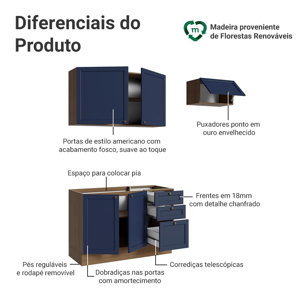 A Cozinha Compacta da Linha Vik da Madesa é a escolha ideal para quem busca maximizar o espaço sem abrir mão de elegância e praticidade. Com 180 cm de largura, essa cozinha compacta oferece organização inteligente e um design clássico, que une o charme do estilo americano com toques modernos e sofisticados.Além disso, a linha Vik é funcional em cada detalhe. As portas possuem dobradiças com amortecimento, garantindo um fechamento suave e silencioso, enquanto as gavetas permitem abertura total, garantindo muito mais facilidade. O acabamento de alta resistência da estrutura é em tom amadeirado Rustic e das frentes em Azul, possui uma textura suave ao toque. O destaque fica por conta dos puxadores ponto em ouro envelhecido, feitos com metal resistente, trazem personalidade e um charme único.Os armários e balcões foram cuidadosamente projetados para aproveitar ao máximo o espaço, o balcão de pia, permite a instalação de pia de inox ou pedra. Além disso, o aéreo com porta basculante possui um sistema de pistão a gás que mantém a porta suspensa quando aberta, proporcionando mais praticidade e segurança no uso diário.Medidas totais:Altura: 225 cmLargura: 180 cmProfundidade: 52 cm (módulos inferiores) 31 cm (aéreos)O que você recebe:1 Aéreo de 120 cm com 2 portas1 Balcão de Pia com 2 portas e 3 gavetas (não acompanha tampo)1 Aéreo de 60 cm com 1 porta basculanteCódigo do produto: GRVK180002M1É Importante saber:As imagens são meramente ilustrativas; os eletros e a decoração não acompanham o produto;A Madesa não oferece serviço de montagem;Produto acompanha manual e ferragens necessárias.A Madesa se dedica à sustentabilidade: temos uma usina própria que gera energia para uma de nossas fábricas, priorizamos fornecedores responsáveis e reciclamos plásticos na produção. Também investimos no desenvolvimento dos colaboradores e em ações sociais.