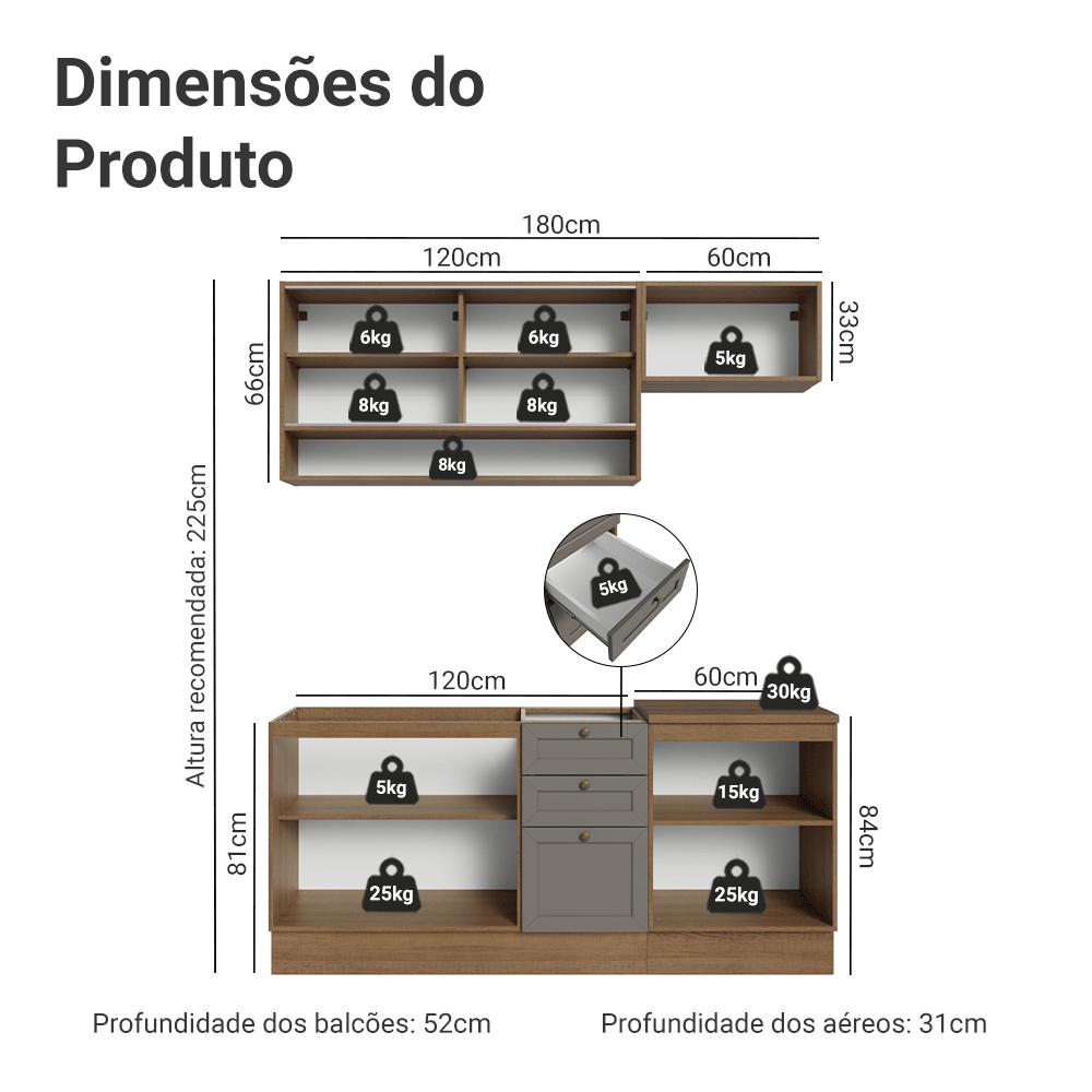 A Cozinha Compacta da Linha Vik da Madesa é a solução ideal para quem busca otimizar espaços menores sem abrir mão de elegância e praticidade. Com 180 cm de largura, essa cozinha oferece uma organização inteligente e um design sofisticado, perfeito para transformar sua cozinha.O acabamento de alta resistência da estrutura é em tom amadeirado Rustic, das frentes em Cinza e possui uma textura suave ao toque. O destaque fica por conta dos puxadores ponto em ouro envelhecido, feitos com metal resistente, trazem personalidade e um charme único. Outro diferencial está no detalhe chanfrado das frentes, que forma molduras elegantes e dá profundidade ao design.A linha Vik é funcional em cada detalhe. As portas possuem dobradiças com amortecimento, garantindo um fechamento suave e silencioso, enquanto as gavetas permitem abertura total, para você organizar tudo com mais facilidade.Medidas:- 225 cm de altura- 180 cm de largura- 52 cm de profundidade nos balcões e 31cm nos aéreosO que você recebe:- Um Aéreo de 120 cm com duas portas de correr com vidro reflex e um nicho- Um Balcão de Pia de 120 cm com duas portas e três gavetas (Não acompanha o tampo)- Um Aéreo de 60 cm com uma porta basculante- Um Balcão de 60 cm com uma porta e tampoCódigo do produto: GRVK180005F9É importante saber:- Material: MDP- Imagens meramente ilustrativas, a decoração não acompanha o produto- A Madesa não disponibiliza serviço de montagem- O produto segue com manual de instalação e todas as ferragens necessárias para sua montagemA Madesa se dedica à sustentabilidade com várias iniciativas: temos uma usina própria que gera energia para uma das fábricas. Priorizamos fornecedores responsáveis com o meio ambiente. Todo o plástico utilizado na produção é reciclado, e as sobras também são reaproveitadas. Investimos no desenvolvimento de nossos colaboradores e em ações que beneficiem a comunidade.