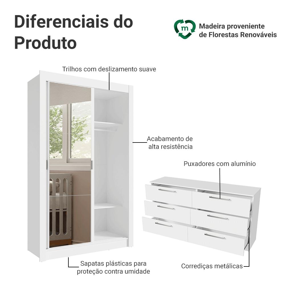 Este Kit para Dormitório Infantil Madesa vai deixar o quarto das crianças mais moderno e aconchegante.O guarda-roupa do conjunto é equipado com portas de correr que deslizam suavemente, graças aos trilhos em alumínio, garantindo um funcionamento suave. Uma delas conta com espelhos, que são muito úteis no dia a dia.Conta com diversos nichos internos que facilitam a organização de roupas, calçados e acessórios. O tubo cabideiro metálico é ideal para pendurar roupas longas.Já a cômoda infantil conta com seis gavetas espaçosas para armazenar roupas, acessórios e brinquedos. Fabricada com materiais de ótima qualidade, possui corrediças metálicas, puxadores em alumínio e sapatas plásticas que protegem contra a umidade.Para completar, o acabamento branco dos produtos é resistente e garante maior durabilidade ao móvel.Medidas do guarda-roupa:- 205 cm de altura- 117 cm de largura- 51 cm de profundidadeMedidas da cômoda:- 76 cm de altura- 150 cm de largura- 39 cm de profundidadeO que você recebe:- Um (1) Guarda-Roupa com duas portas de correr sendo uma com espelhos- Uma (1) Cômoda com seis gavetas- Manual de montagem e ferragensCódigo do produto: MDDR02004909É bom saber:- Imagens meramente ilustrativas- A Madesa não disponibiliza serviço de montagem- Material: MDPA Madesa se dedica à sustentabilidade com várias iniciativas: temos uma usina própria para gerar energia que abastece uma de nossas fábricas. Selecionamos nossos fornecedores, priorizando aqueles que possuem um compromisso com a sustentabilidade e proteção do meio ambiente. Todo o plástico utilizado no setor produtivo é proveniente de reciclagem e as suas sobras são encaminhadas ao fornecedor que os recicla. Também investimos no desenvolvimento contínuo de nossos colaboradores e em ações educacionais que beneficiem a comunidade.
