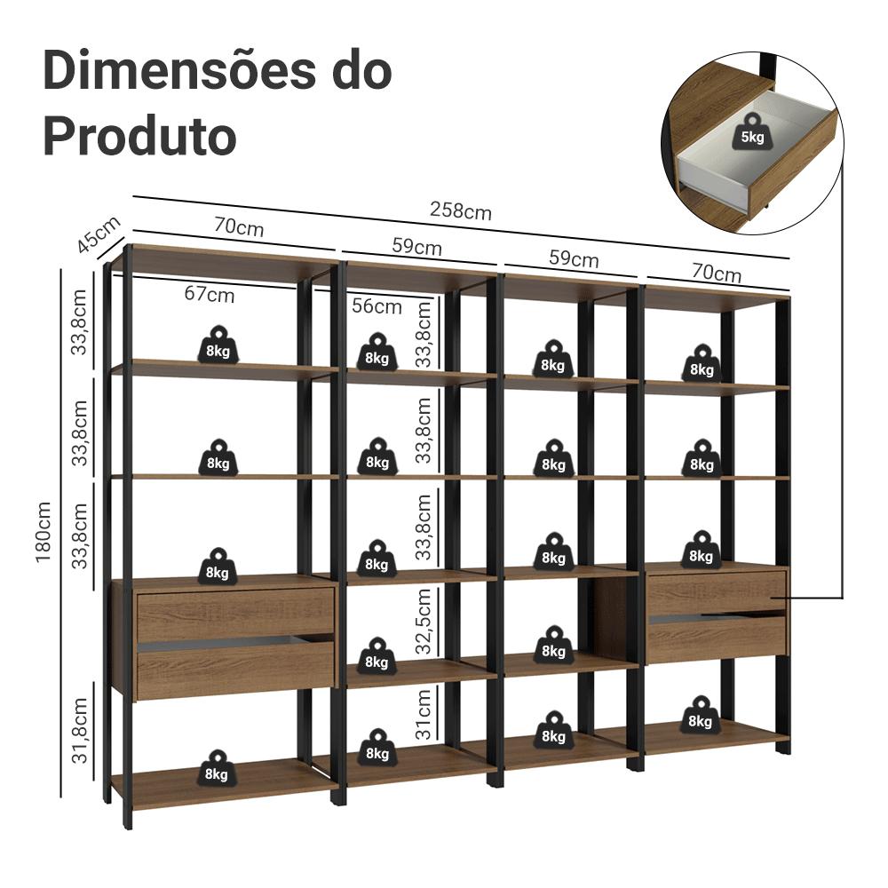O Closet Guarda-Roupa da Madesa é moderno, espaçoso e funcional, ideal para transformar o seu dormitório.Com um design aberto e inteligente, o closet facilita o acesso às roupas e acessórios, tornando seu dia a dia mais prático e organizado.O espaço disponível nesta versão é o grande destaque. Conta com dezesseis prateleiras e quatro gavetas amplas, perfeitas para acomodar roupas, calçados, malas, lençóis e muito mais, garantindo tudo sempre à mão.Além da funcionalidade, o acabamento de alta resistência combina os tons preto e amadeirado Rustic, trazendo um toque sofisticado ao ambiente.Medidas totais:- 180 cm de altura- 258 cm de largura- 45 cm de profundidadeO que você recebe:- Dois (2) Closets avulsos de 70 cm com duas (2) gavetas e quatro (4) prateleiras cada- Dois (2) Closets avulsos de 59 cm com cinco (5) prateleiras cada- Manual de montagem e ferragensCódigo do produto: MDDR0400067KÉ bom saber:- As imagens são meramente ilustrativas- A Madesa não oferece serviço de montagem- Por segurança, é obrigatório fir o móvel na parede- Estruturas laterais em MDP com pintura em preto texturizadoA Madesa se dedica à sustentabilidade com várias iniciativas: temos uma usina própria para gerar energia que abastece uma de nossas fábricas. Selecionamos nossos fornecedores, priorizando aqueles que possuem um compromisso com a sustentabilidade e proteção do meio ambiente. Todo o plástico utilizado no setor produtivo é proveniente de reciclagem e as suas sobras são encaminhadas ao fornecedor que os recicla. Também investimos no desenvolvimento contínuo de nossos colaboradores e em ações educacionais que beneficiem a comunidade.
