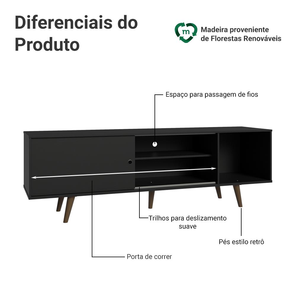 A sala de estar é o espaço da casa onde a gente relaxa e curte bons momentos. Por isso, vale investir em um móvel que una praticidade e elegância como o Rack Torino da Madesa.Inspirado no design contemporâneo, ele traz uma estrutura funcional e moderna, com três nichos de tamanhos variados e uma porta de correr. Ideal para acomodar eletrônicos, livros ou decorações.Na parte de trás, a abertura para passagem dos fios facilita a organização dos cabos. Já os pés no tom amadeirado Rustic garantem charme e estabilidade. O acabamento preto confere um toque sofisticado e combina com diversos estilos de decoração.O Rack Torino é um móvel funcional e cheio de estilo, perfeito para transformar sua sala de estar.Medidas do produto montado:- 160 cm de largura- 39 cm de profundidade- 53 cm de alturaO que você recebe:- Um Rack para TV até 80 Polegadas com 1 Porta e 3 nichosCódigo do produto: MDES010001N5É importante saber:- Material: MDP- Imagens meramente ilustrativas, a decoração não acompanha o produto- A Madesa não disponibiliza serviço de montagem- O produto segue com manual de instalação e todas as ferragens necessárias para sua montagemA Madesa se dedica à sustentabilidade com várias iniciativas: temos uma usina própria que gera energia para uma das fábricas. Priorizamos fornecedores responsáveis com o meio ambiente. Todo o plástico utilizado na produção é reciclado, e as sobras também são reaproveitadas. Investimos no desenvolvimento de nossos colaboradores e em ações que beneficiem a comunidade.