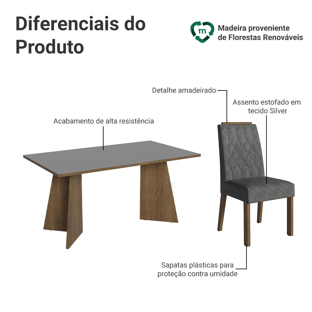 A Sala de Jantar Tulum da Madesa foi projetada para transformar seus momentos à mesa em experiências únicas. Com um design contemporâneo, o conjunto une elegância e praticidade, proporcionando um ambiente mais acolhedor.A mesa com tampo em MDP, proporciona uma superfície robusta e resistente. Sua estrutura possui o design da base em formato trapézio, trazendo um visual moderno para a sua sala de jantar. O diferencial está no detalhe amadeirado no topo das cadeiras, que valoriza o design, e proporciona durabilidade do móvel.O acabamento da base da mesa é em tom amadeirado Rustic e do tampo em cinza, trazendo um toque moderno. As cadeiras são revestidas em tecido Suede Silver, completam o conjunto com sua textura suave, oferecendo um conforto adicional durante as refeições. Esse conjunto é a escolha ideal para quem busca aliar beleza, conforto e praticidade em um único espaço.Medidas da Mesa:- 78 cm de altura- 160 cm de largura- 90 cm de profundidadeMedidas de cada Cadeira:- 96 cm de altura- 45 cm de largura- 57 cm de profundidadeO que você recebe:- Uma Mesa com base em formato trapézio e tampo de MDP- Quatro Cadeiras Estofadas com Detalhe AmadeiradoCódigo do produto: MDJA040209F9SLÉ importante saber:- Material: MDP- Imagens meramente ilustrativas, a decoração não acompanha o produto- A Madesa não disponibiliza serviço de montagem- O produto segue com manual de instalação e todas as ferragens necessárias para sua montagemA Madesa se dedica à sustentabilidade com várias iniciativas: temos uma usina própria que gera energia para uma das fábricas. Priorizamos fornecedores responsáveis com o meio ambiente. Todo o plástico utilizado na produção é reciclado, e as sobras também são reaproveitadas. Investimos no desenvolvimento de nossos colaboradores e em ações que beneficiem a comunidade.