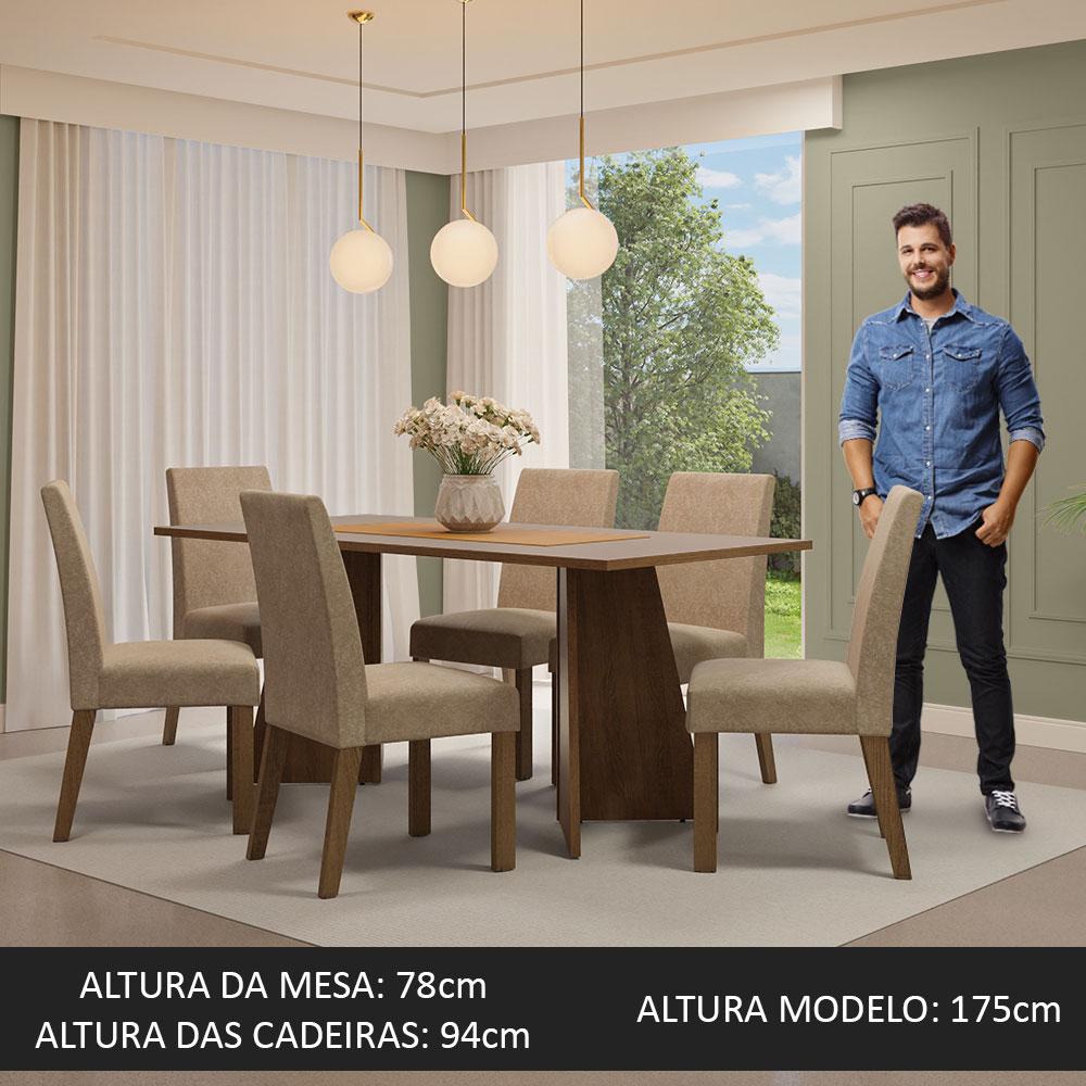 O Conjunto de Jantar Simone da Madesa vai deixar sua refeições muito mais confortáveis. É a opção ideal tanto para a cozinha quando para a sala de jantar.A mesa de jantar do conjunto possui design super atual, com tampo amplo em MDP e ótimo espaço disponível.As cadeiras transmitem conforto e robustez. Conta com estrutura em MDP e MDF e estofamento em espuma de alta densidade, revestido com tecido Suede Imperial.O acabamento combina os tons Crema e amadeirado Rustic. É aplicado em Pintura Poliéster ecológica, garantindo resistência a álcool, água e calor.Medidas da cadeira: - 94 cm de altura- 45 cm de largura- 57 cm de profundidadeMedidas da mesa: - 78 cm de altura- 180 cm de largura- 90 cm de profundidadeO que você recebe: - Uma (1) Mesa com tampo de MDP- Seis (6) Cadeiras com assento e encosto estofados- Manual e ferragens necessárias para a instalaçãoCódigo do produto: MDJA060170J8SMÉ bom saber: - Imagens meramente ilustrativas- A Madesa não oferece serviço de montagemA Madesa se dedica à sustentabilidade com várias iniciativas: temos uma usina própria para gerar energia que abastece uma de nossas fábricas. Selecionamos nossos fornecedores, priorizando aqueles que possuem um compromisso com a sustentabilidade e proteção do meio ambiente. Todo o plástico utilizado no setor produtivo é proveniente de reciclagem e as suas sobras são encaminhadas ao fornecedor que os recicla. Também investimos no desenvolvimento contínuo de nossos colaboradores e em ações educacionais que beneficiem a comunidade.