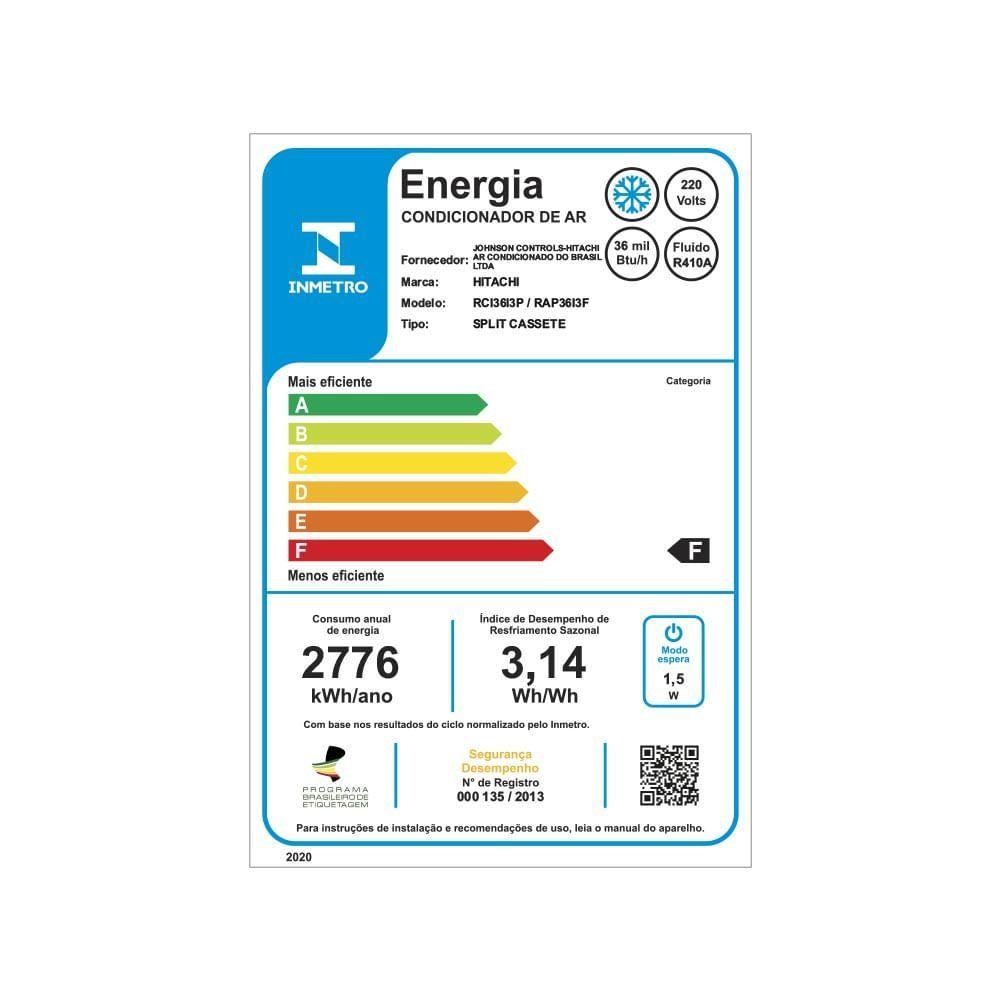 Ar Condicionado Split Cassete Hitachi 4 Vias 36.000 BTUs Frio 220VO airCore 500 é o Split On/Off ideal para escritórios e pontos comerciais de pequeno a médio porte, oferecendo conforto térmico, praticidade e recursos avançados para um desempenho superior.Principais RecursosDisplay LEDO painel do Cassete possui display de LED que facilita a visualização da temperatura selecionada.Bomba de DrenoBomba de dreno incorporada, permitindo maior flexibilidade de instalação, com capacidade de bombear água até 850 mm acima da unidade.Fluxo de ar em 360ºAs grelhas do Cassete 4 vias direcionam o ar para todos os lados do ambiente, garantindo distribuição uniforme.Modo TurboAo acionar o modo turbo, o equipamento opera em capacidade máxima e atinge a temperatura desejada em menos tempo.Baixo Nível de RuídoA função Mute permite que a unidade interna opere em velocidade super baixa, tornando o aparelho ainda mais silencioso.Filtros de arO airCore 500 acompanha kit de filtragem G1 de tela lavável, que retém impurezas mais grossas presentes no ar.Proteção, Segurança e Renovação de ArPreparado para instalação de tomada de ar externo, promovendo renovação de ar e mantendo o ambiente fresco.Aletado de alumínio Hidrofílico – Blue: aumenta a eficiência da troca de calor e reduz o acúmulo de água nas aletas.Revestimento azul que melhora a proteção contra corrosão e garante maior confiabilidade.Itens de segurança: placa eletrônica e componentes blindados por invólucro de aço, com proteção contra propagação de chamas e contato seco para chave tipo Hotel e Sensor de Fumaça.Unidade ExternaGrade superior e tampa da caixa elétrica em plástico, oferecendo maior resistência à corrosão.Gabinetes em chapa de aço galvanizada com pintura epóxi resistente a mais de 500 horas de salt spray.Trocador de calor com tubos de cobre e aletas de alumínio.Ventilador em plástico de engenharia, imune à corrosão e com baixo nível de ruído.Controle e OperaçãoControle remoto sem fio com display.Ajuste de 3 velocidades e movimento dos defletores.Especificações TécnicasCiclo: FrioVoltagem: 220VCapacidade de Refrigeração: 36.000 BTUs (BTU/h e kW/h conforme especificado)Serpentina: CobreVolumes de embalagem: 2Controle de temperatura: SimTipo de ar condicionado: CasseteTipo de alimentação: ElétricaCódigo Evaporadora: SCI36J3FCódigo Modelo: SCI36J3FCódigo Grelha: D51917BGarantiaGarantia total de 3 anos.Para assegurar e manter a garantia estendida, é necessário seguir as orientações do Certificado de Garantia.Consultar condições no Guia Rápido do Usuário.