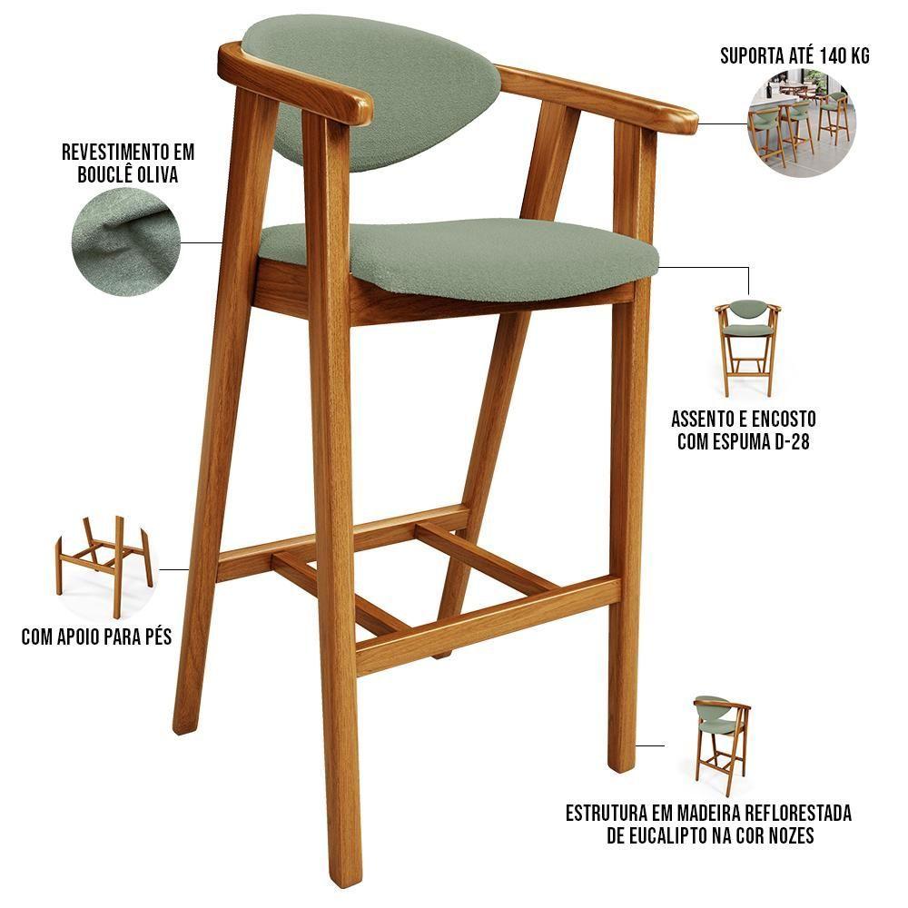 Kit 04 Banquetas Alta Para Cozinha Bancada Bar Sala De Jantar Fixa Cecília L02 Bouclê Oliva - LyamA melhor escolha para os momentos de confraternização no aconchego da sua casa, acaba de chegar! O Kit 04 Banquetas Altas Cecília vem com a personalidade e elegância que sua decoração merece! É ideal desde refeições rápidas, até um Happy Hour com os amigos, família. Seu design único valoriza o ambiente, sem deixar pra trás a beleza e qualidade! Para deixar a sua área gourmet mais aconchegante, ela possui assento e encosto estofados, confeccionados com materiais de excelente qualidade, e extremamente resistentes.Possui altura ideal, garantindo o encaixe perfeito no ambiente, otimizando seu espaço e promovendo máximo conforto. Pode ser usada em bancada, cozinha americana, home bar, ou área gourmet! As possibilidades são infinitas e as combinações ficarão extremamente elegantes. Adquira já a sua!Dimensões do produto (L x A x P)51 x 102 x 47 cmMedidas Internas:Altura do encosto: 22 cmAltura total do encosto: 33 cmLargura do encosto: 41 cmAltura do assento: 4,5 cmAltura do chão ao braço: 88 cmProfundidade do assento: 46,5 cmLargura do assento: 44 cmAltura interna do braço: 18 cmAltura do chão ao assento: 70 cmAltura do chão ao apoio de pés: 30 cmAltura do apoio de pés: 4,5 cmLargura interna do apoio de pés: 27 cmCaracterísticas:Estrutura em madeira de reflorestamento de eucalipto vermelho tratado.Revestimento em Bouclê na cor Oliva.Assento com espuma D-28.Encosto com espuma D-28.Peso suportado: Até 140 kg.Estrutura de Madeira na cor Nozes.Produto entregue montado.- Por se tratar de estofado as medidas podem ter uma pequena variação de até 3 cm.- A tonalidade do produto real poderá ter ligeira variação devido o lote de tecidos.- A limpeza deve ser feita com pano levemente umedecido em água limpa, sem esfregar, não utilizar produtos abrasivos, desengordurantes, álcool ou solvente.- Nunca sentar nos braços ou encosto do produto.Observações importantes:- Produto para uso residencial em ambiente interno, não devendo ficar exposto diretamente ao sol, calor e umidade excessivos.- Pode haver alguma diferença de tonalidade entre a imagem e o produto real, por conta do tratamento de imagens e a calibração de cores do seu monitor.- As imagens são meramente ilustrativas, não acompanham objetos de decoração e eletrônicos.- Ao receber a mercadoria, o cliente deve verificar as condições da embalagem, caso haja alguma não assine o de .- Montagem, desmontagem e outras instalações serão de responsabilidade do cliente. Não nos responsabilizamos, no ato da , por subir escadas/elevadores ou pelo por guincho em apartamentos. Eventuais despesas são de responsabilidade do comprador.- Confira as dimensões do produto e certifique-se de que passará normalmente por supostos elevadores, portas, escadas e/ou corredores de sua residência.