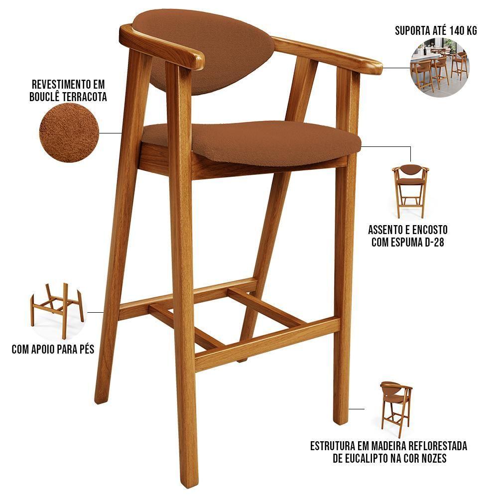 Kit 04 Banquetas Alta Cozinha Bancada Bar Sala De Jantar Fixa Cecília L02 Bouclê Terracota - LyamA melhor escolha para os momentos de confraternização no aconchego da sua casa, acaba de chegar! O Kit 04 Banquetas Altas Cecília vem com a personalidade e elegância que sua decoração merece! É ideal desde refeições rápidas, até um Happy Hour com os amigos, família. Seu design único valoriza o ambiente, sem deixar pra trás a beleza e qualidade! Para deixar a sua área gourmet mais aconchegante, ela possui assento e encosto estofados, confeccionados com materiais de excelente qualidade, e extremamente resistentes.Possui altura ideal, garantindo o encaixe perfeito no ambiente, otimizando seu espaço e promovendo máximo conforto. Pode ser usada em bancada, cozinha americana, home bar, ou área gourmet! As possibilidades são infinitas e as combinações ficarão extremamente elegantes. Adquira já a sua!Dimensões do produto (L x A x P)51 x 102 x 47 cmMedidas Internas:Altura do encosto: 22 cmAltura total do encosto: 33 cmLargura do encosto: 41 cmAltura do assento: 4,5 cmAltura do chão ao braço: 88 cmProfundidade do assento: 46,5 cmLargura do assento: 44 cmAltura interna do braço: 18 cmAltura do chão ao assento: 70 cmAltura do chão ao apoio de pés: 30 cmAltura do apoio de pés: 4,5 cmLargura interna do apoio de pés: 27 cmCaracterísticas:Estrutura em madeira de reflorestamento de eucalipto vermelho tratado.Revestimento em Bouclê na cor Terracota.Assento com espuma D-28.Encosto com espuma D-28.Peso suportado: Até 140 kg.Estrutura de Madeira na cor Nozes.Produto entregue montado.- Por se tratar de estofado as medidas podem ter uma pequena variação de até 3 cm.- A tonalidade do produto real poderá ter ligeira variação devido o lote de tecidos.- A limpeza deve ser feita com pano levemente umedecido em água limpa, sem esfregar, não utilizar produtos abrasivos, desengordurantes, álcool ou solvente.- Nunca sentar nos braços ou encosto do produto.Observações importantes:- Produto para uso residencial em ambiente interno, não devendo ficar exposto diretamente ao sol, calor e umidade excessivos.- Pode haver alguma diferença de tonalidade entre a imagem e o produto real, por conta do tratamento de imagens e a calibração de cores do seu monitor.- As imagens são meramente ilustrativas, não acompanham objetos de decoração e eletrônicos.- Ao receber a mercadoria, o cliente deve verificar as condições da embalagem, caso haja alguma não assine o de .- Montagem, desmontagem e outras instalações serão de responsabilidade do cliente. Não nos responsabilizamos, no ato da , por subir escadas/elevadores ou pelo por guincho em apartamentos. - Confira as dimensões do produto e certifique-se de que passará normalmente por supostos elevadores, portas, escadas e/ou corredores de sua residência.
