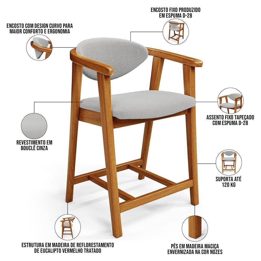 Kit 04 Banquetas Baixa Para Cozinha Sala Jantar Bancada Cecília L02 Bouclê Cinza - Lyam DecorCrie um ambiente sofisticado e acolhedor com o Kit 04 Banquetas Baixa Cecília, da Lyam Decor. Com design moderno essa banqueta é uma peça muito versátil, pois você pode aproveitá-la em diversos ambientes, desde cozinha, sala de jantar, bancada até a área gourmet ou bar e, assim, agregar o máximo de beleza e conforto. Afinal, essa banqueta de madeira se destaca pela sua estrutura robusta que resistência e durabilidade. Já o assento estofado oferece o máximo conforto, enquanto o encosto proporciona suporte ergonômico sem igual. Combinando elegância e praticidade, essa banqueta baixa com encosto é perfeita para quem deseja um toque de requinte em qualquer ambiente. Adicione um charme especial ao seu lar com essa peça indispensável. Adicione ao seu carrinho e desfrute momentos de alegria com a Banqueta Cecília!Dimensões da Banqueta (L x A x P) 51 x 90 x 47 cmMedidas Internas: Altura do chão ao assento: 60 cm Assento livre (L x A x P): 44 x 4,5 x 46,5 cm Encosto livre (L x A): 41 x 22 cm Altura total do encosto: 33 cm Altura interna do braço: 18 cm Altura do chão ao início do braço: 76 cm Altura do chão ao apoio de pés: 17 cm Largura interna do apoio de pés: 27 cm Altura do apoio de pés: 4,5 cmCaracterísticas: Estrutura em madeira de reflorestamento de eucalipto vermelho tratado. Revestimento em tecido Bouclê de alta qualidade na cor Cinza. Assento e encosto fixos tapeçados com espuma D-28. Encosto com design curvo para maior conforto e ergonomia. Pés em madeira maciça envernizada na cor Nozes. Peso suportado: Até 120 kg.- Nunca sentar nos braços ou encosto do produto. - Por se tratar de estofado as medidas podem ter uma pequena variação de até 3 cm. - A tonalidade do produto real poderá ter ligeira variação devido o lote de tecidos. - Indicado para uso residencial, sua limpeza deve ser feita com pano levemente umedecido em água limpa, sem esfregar, não utilizar produtos abrasivos, desengordurantes, álcool ou solvente.Observações importantes: - Produto para uso residencial em ambiente interno, não devendo ficar exposto diretamente ao sol, calor e umidade excessivos. - Pode haver alguma diferença de tonalidade entre a imagem e o produto real, por conta do tratamento de imagens e a calibração de cores do seu monitor. - As imagens são meramente ilustrativas, não acompanham objetos de decoração e eletrônicos. - Ao receber a mercadoria, o cliente deve verificar as condições da embalagem, caso haja alguma não assine o de e com nossa para orientações. - Montagem, desmontagem e outras instalações serão de responsabilidade do cliente. Não nos responsabilizamos, no ato da , por subir escadas/elevadores ou pelo por guincho em apartamentos. Eventuais despesas são de responsabilidade do comprador. - Confira as dimensões do produto e certifique-se de que passará normalmente por supostos elevadores, portas, escadas e/ou corredores de sua residência. - Para mais informações, acesse nossa Central de . Com apoio de braços: Sim