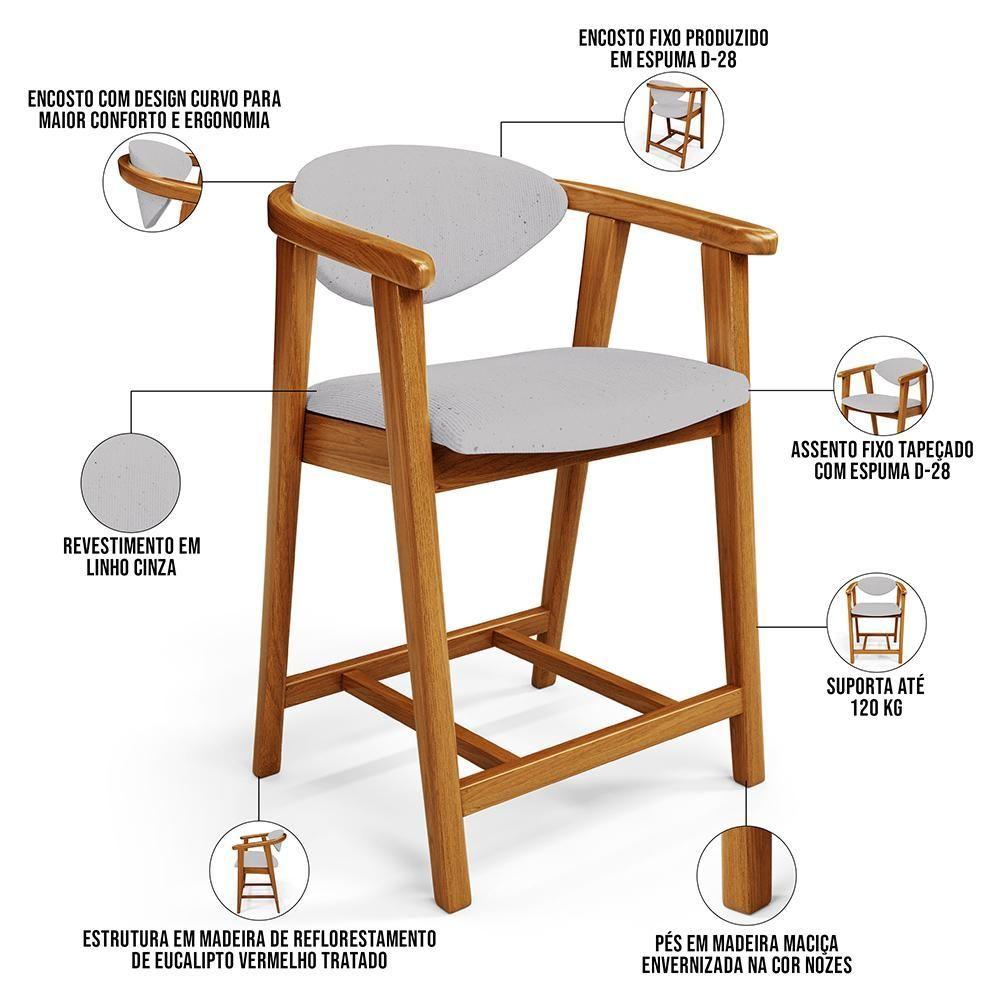 Kit 04 Banquetas Baixa Para Cozinha Sala Jantar Bancada Cecília L02 Linho Cinza - Lyam DecorCrie um ambiente sofisticado e acolhedor com o Kit 04 Banquetas Baixa Cecília, da Lyam Decor. Com design moderno essa banqueta é uma peça muito versátil, pois você pode aproveitá-la em diversos ambientes, desde cozinha, sala de jantar, bancada até a área gourmet ou bar e, assim, agregar o máximo de beleza e conforto. Afinal, essa banqueta de madeira se destaca pela sua estrutura robusta que resistência e durabilidade. Já o assento estofado oferece o máximo conforto, enquanto o encosto proporciona suporte ergonômico sem igual. Combinando elegância e praticidade, essa banqueta baixa com encosto é perfeita para quem deseja um toque de requinte em qualquer ambiente. Adicione um charme especial ao seu lar com essa peça indispensável. Adicione ao seu carrinho e desfrute momentos de alegria com a Banqueta Cecília!Dimensões da Banqueta (L x A x P) 51 x 90 x 47 cmMedidas Internas: Altura do chão ao assento: 60 cm Assento livre (L x A x P): 44 x 4,5 x 46,5 cm Encosto livre (L x A): 41 x 22 cm Altura total do encosto: 33 cm Altura interna do braço: 18 cm Altura do chão ao início do braço: 76 cm Altura do chão ao apoio de pés: 17 cm Largura interna do apoio de pés: 27 cm Altura do apoio de pés: 4,5 cmCaracterísticas: Estrutura em madeira de reflorestamento de eucalipto vermelho tratado. Revestimento em tecido Linho de alta qualidade na cor Cinza. Assento e encosto fixos tapeçados com espuma D-28. Encosto com design curvo para maior conforto e ergonomia. Pés em madeira maciça envernizada na cor Nozes. Peso suportado: Até 120 kg.- Nunca sentar nos braços ou encosto do produto. - Por se tratar de estofado as medidas podem ter uma pequena variação de até 3 cm. - A tonalidade do produto real poderá ter ligeira variação devido o lote de tecidos. - Indicado para uso residencial, sua limpeza deve ser feita com pano levemente umedecido em água limpa, sem esfregar, não utilizar produtos abrasivos, desengordurantes, álcool ou solvente.Observações importantes: - Produto para uso residencial em ambiente interno, não devendo ficar exposto diretamente ao sol, calor e umidade excessivos. - Pode haver alguma diferença de tonalidade entre a imagem e o produto real, por conta do tratamento de imagens e a calibração de cores do seu monitor. - As imagens são meramente ilustrativas, não acompanham objetos de decoração e eletrônicos. - Ao receber a mercadoria, o cliente deve verificar as condições da embalagem, caso haja alguma não assine o de e com nossa para orientações. - Montagem, desmontagem e outras instalações serão de responsabilidade do cliente. Não nos responsabilizamos, no ato da , por subir escadas/elevadores ou pelo por guincho em apartamentos. Eventuais despesas são de responsabilidade do comprador. - Confira as dimensões do produto e certifique-se de que passará normalmente por supostos elevadores, portas, escadas e/ou corredores de sua residência. - Para mais informações, acesse nossa Central de . Com apoio de braços: Sim