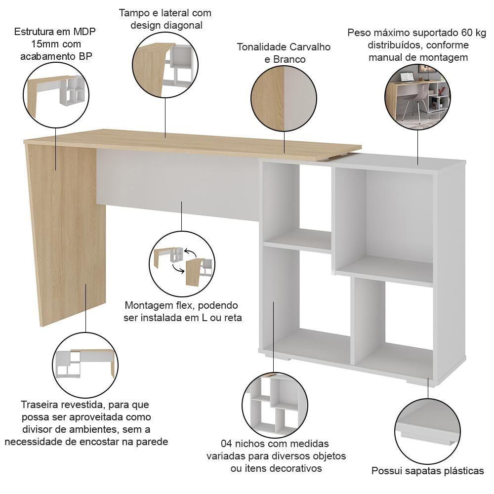 Mesa Para Escritório Escrivaninha Home Office Urban A02 Carvalho Branco - Lyam Decor