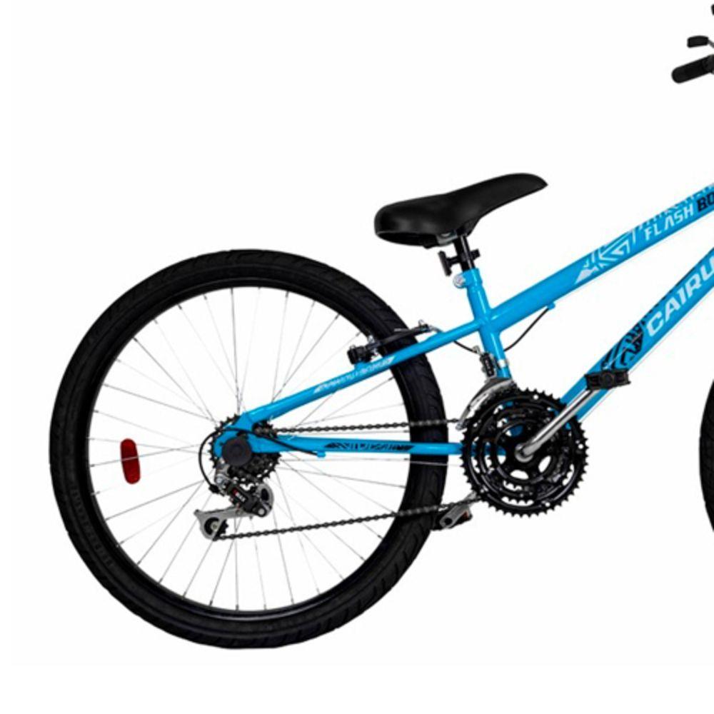 Bic Aro24 21m. Masc Flash Cores Cairu - 311891 Azul TurquesaAros 24 em alum?nio com paredes simples, 36 furos.Descanso lateral.Raios 18 MarchasFreio V-break.Guid?o a?o carbono.Quadro em a?o carbono.21 Velocidades.Kit de seguran?a.Garantia do Fornecedor contra de fabrica??o: 12 Meses.