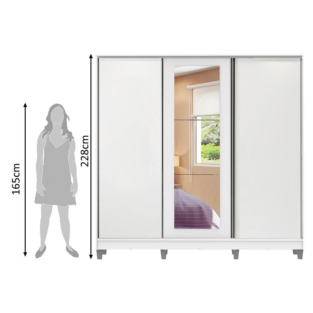 Guarda-Roupa Eros 3 Portas Correr 1 Espelho 100% MDF MadesaCaracterísticas do Produto:- O guarda-roupa Eros da Madesa é fabricado em 100% MDF e com ferragens de alta qualidade.- O destaque fica para a ótima distribuição interna, uma das maiores da categoria.- Internamente, conta com quatro gavetas espaçosas e resistentes, com corrediças metálicas.- Os três tubos cabideiros em alumínio comportam qualquer tamanho de cabide.- O espaço é perfeito para uma melhor organização de roupas, sapatos, acessórios, edredons e travesseiros.- As portas de correr com puxadores em alumínio possuem deslizamento suave e são muito práticas no dia a dia.- A porta espelhada amplia o ambiente e traz muita sofisticação ao móvel, sem comprometer a circulação.- Possui pés reguláveis em PVC que conferem beleza e uma melhor sustentação.- O acabamento interno e externo é branco, feito em Pintura Poliéster de alta resistência que garante a durabilidade do móvel.- Além disso, o processo de pintura é ecológico, livre de vapores que prejudicam a atmosfera.Especificações Técnicas: - Marca: Madesa- Modelo: Eros- Portas: 3 de Correr- Cabideiros: 3 em Alumínio- Prateleiras: 8- Gavetas: 4 Internas- Espelhos: 1- Puxadores: Alumínio- Pés: 8 em PVC- Material: 100% MDF- Acabamento: Pintura Poliéster- Cor: Branco- Dimensões do Produto (LxAxP): 231 cm X 228 cm X 55 cm- Dimensões da Embalagem (LxAxP): 77,3 cm X 60,3 cm X 237,2 cm- Peso Bruto: 194,3 kgGarantia: 3 meses