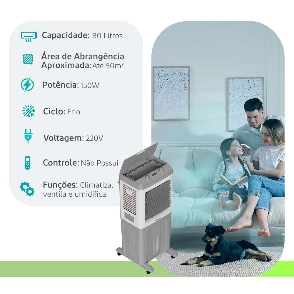 Climatizador Industrial Nacional Ventisol 80 Litros 150W 220V Monofásico CLIN80PRO-02 BR/CZClimatizador Ventisol: Conforto e Saúde para Sua Família! Apresentamos o Climatizador Ventisol, um produto inovador que não apenas refresca o ambiente, mas também melhora a qualidade do ar, proporcionando mais saúde e bem-estar para todos. Destaques do Produto:Filtro Tipo Colmeia: Proporciona um resfriamento eficiente e purifica o ar, ajudando a combater impurezas e prevenindo doenças respiratórias decorrentes do ar seco. Reservatório de 80 Litros: Com grande capacidade e triplo abastecimento, facilitando o uso pelas laterais ou pela tampa superior.Compartimento de Gelo: Adicione gelo no reservatório superior para uma refrigeração ainda mais potente.Funcionalidade 5 em 1: Ventilação: Funciona como ventilador, oferecendo frescor imediato.Climatização: Eficaz na redução do calor ambiente.Umidificação: Mantém o ar úmido, aliviando alergias e melhorando a respiração.Filtragem: O sistema de filtro colmeia refresca e purifica o ambiente; o filtro é lavável.Circulação: Promove a troca constante de ar, neutralizando odores. Benefícios para a Saúde: Garante um ambiente mais saudável e acolhedor. Mantém a umidade do ar, prevenindo doenças respiratórias. O sistema evaporativo colmeia assegura um ar mais limpo e saudável.Sustentabilidade: Feito com material reciclado, o Climatizador Ventisol é uma opção ecológica. Proporciona economia de energia, ajudando a reduzir o consumo elétrico. Produto nacional, apoiando a economia local.Conforto e Facilidade: Função de liga/desliga para climatização. Três velocidades de ventilação, ajustáveis conforme a necessidade. Oscilação automática e aletas ajustáveis para melhor direcionamento do ar.Proteção Inteligente: Sistema de proteção para a bomba, que desliga automaticamente na falta de água, prolongando a vida útil do produto. Mude o ambiente da sua casa com o Climatizador Ventisol, a solução ideal para um ar mais fresco, limpo e saudável. Adquira o seu agora e sinta a diferença!Especificações Técnicas:Marca: AgrattoCor: Branco e cinzaTemperatura: FrioVoltagem: 220VFase: MonofásicoCorrente elétrica de refrigeração (A): 0,42ACorrente elétrica de aquecimento (A): 150WCiclo: FrioFase: MonofásicoVazão de ar: 4500Controle de ar (cima/baixo): AutomáticoControle de ar (direita/esquerda): ManualGarantia do Produto: 1 AnoCódigo EAN: 7898461976322Largura: 35,5Altura: 117,5Profundidade: 50,0Código Modelo Condensadora: CLIN80PRONCM: 84796000Categoria: ClimatizadorSobre a Garantia do ProdutoGarantia legal de 90 (noventa) dias a contar da data da compra conforme Nota Fiscal, atendendo ao código de defesa do consumidor. A garantia abrange defeitos de fabricação do produto. Componentes e acessórios, garantia legal de 90 dias, dentro das condições de prazo estabelecidos, sempre acompanhadas de Nota Fiscal. Para mais informações, consulte o manual do produto.