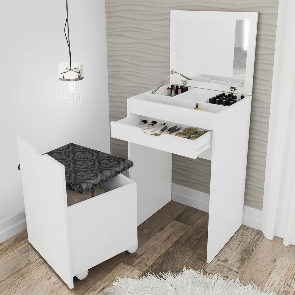 A Penteadeira com Puff e Espelho Multimóveis, funcional e elegante, é indispensável na hora de se cuidar. Possui 1 gaveta, 1 porta basculante, espelho, material em MDP e acabamento em pintura UV. Compacta e funcional, permite acomodar diversos itens e acessórios de forma rápida, facilitando muito na hora de sua utilização.Conteúdo da Embalagem:Penteadeira com PuffManual de MontagemKit FerragemDimensões do produto montado:Altura: 85cm | Largura: 54cm | Profundidade: 45cm*Você pode consultar as medidas internas na imagem técnica do produto.*As cores do produto podem sofrer variações de tonalidade de acordo com as configurações do seu dispositivo.Imagem meramente ilustrativa. Decoração não acompanha o produto.O produto será entregue desmontado e não disponibilizamos o serviço de montagem.