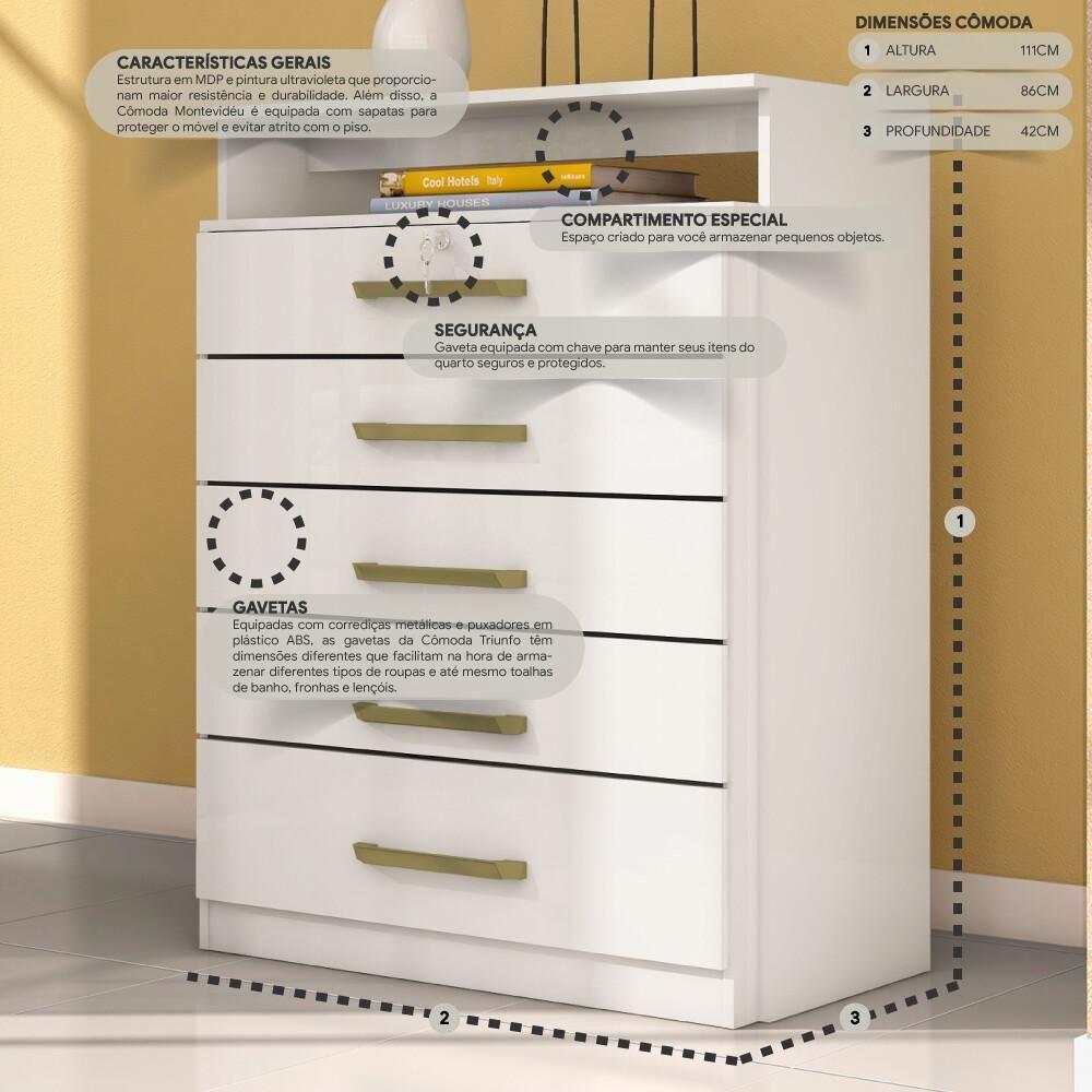 A Cômoda com 5 Gavetas Multimóveis CR40116 é o móvel perfeito para quem busca funcionalidade e estilo. Sua estrutura em MDP e acabamento em pintura UV garantem durabilidade e resistência, proporcionando um produto de alta qualidade. Com cinco gavetas equipadas com corrediças metálicas e puxadores em ABS, você terá espaço de sobra para guardar suas roupas e acessórios. Além disso, uma das gavetas possui chave, oferecendo segurança extra para seus objetos pessoais. A cômoda conta com um compartimento especial projetado especialmente para armazenar pequenos objetos. Possui capacidade de até 3kg por gaveta.Conteúdo da Embalagem:1 (uma) CômodaManual de MontagemKit FerragemDimensões do produto montado:Altura: 111cm | Largura: 86cm | Profundidade: 42cm*Você pode consultar as medidas detalhadas na imagem técnica do produto.*As cores do produto podem sofrer variações de tonalidade de acordo com as configurações do seu dispositivo.Imagem meramente ilustrativa. Decoração não acompanha o produto.O produto será entregue desmontado e não disponibilizamos o serviço de montagem.