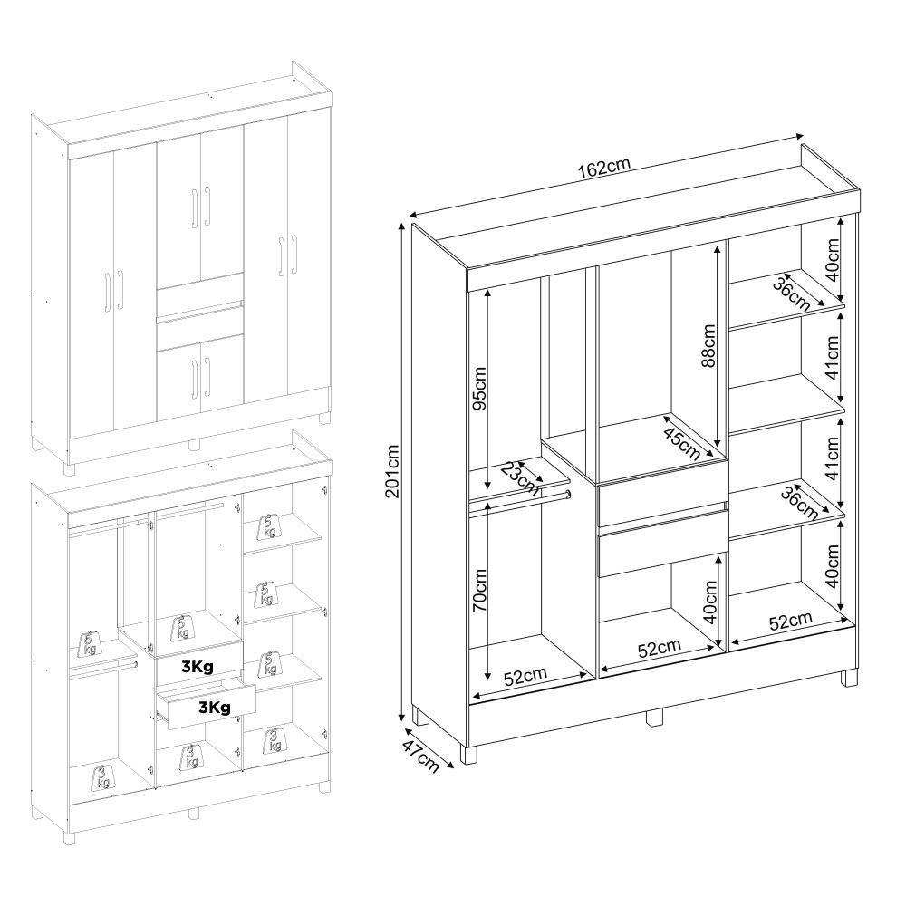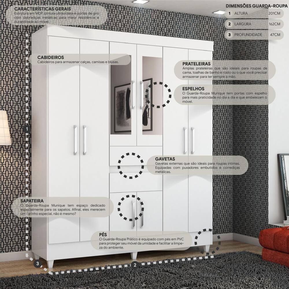O Guarda-Roupas Casal 8 Portas 2 Gavetas e Espelhos Multimóveis CR35196 é a escolha perfeita para quem busca praticidade e estilo no quarto. Sua estrutura em MDP garante durabilidade e resistência, enquanto o acabamento em pintura UV confere um visual moderno ao móvel. Com 8 portas com puxadores em ABS, 2 gavetas externas com corrediças metálicas e 4 prateleiras internas, você terá espaço de sobra para organizar suas roupas e acessórios. Além disso, as portas centrais possuem espelhos que embelezam o móvel e ampliam o ambiente. O guarda-roupa conta ainda com espaço exclusivo para sapatos, cabideiros em madeira, para pendurar suas roupas sem amassar, e pés em PVC, que protegem contra a umidade e facilitam a limpeza do quarto.Conteúdo da Embalagem:1 (um) Guarda-RoupaManual de MontagemKit FerragemDimensões do produto montado:Altura: 201cm | Largura: 162cm | Profundidade: 47cm*Você pode consultar as medidas detalhadas na imagem técnica do produto.*As cores do produto podem sofrer variações de tonalidade de acordo com as configurações do seu dispositivo.Imagem meramente ilustrativa. Decoração não acompanha o produto.O produto será entregue desmontado e não disponibilizamos o serviço de montagem.