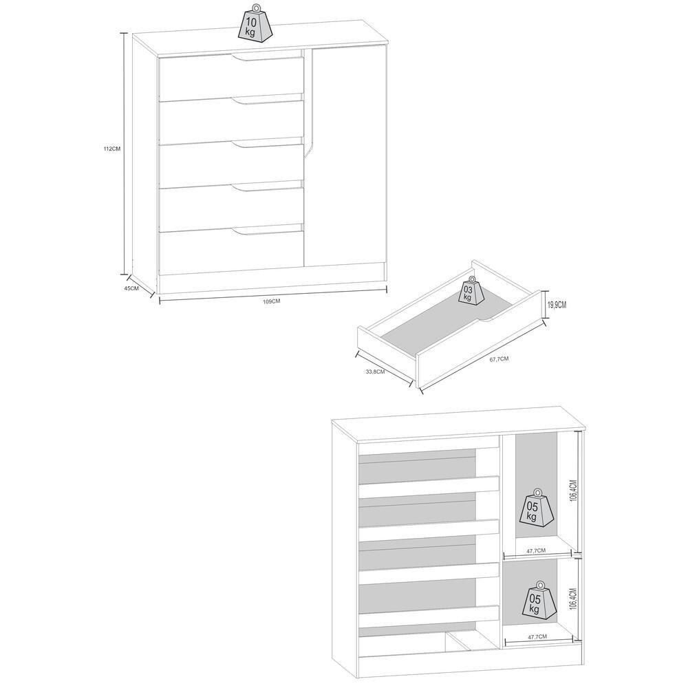 A Cômoda 5 Gavetas 1 Porta Multimóveis CR35147 é a peça perfeita para completar o seu quarto com elegância e funcionalidade. Feita em material MDP de alta qualidade, ela possui um acabamento impecável em pintura UV, garantindo durabilidade e resistência. Com 5 gavetas espaçosas equipadas com corrediças metálicas, você terá muito espaço para organizar suas roupas e acessórios. Além disso, conta também com uma porta e uma prateleira interna que adicionam ainda mais praticidade ao móvel. Conteúdo da Embalagem:1 (uma) CômodaManual de MontagemKit FerragemDimensões do produto montado:Altura: 112cm | Largura: 109cm | Profundidade: 45cm*Você pode consultar as medidas detalhadas na imagem técnica do produto.*As cores do produto podem sofrer variações de tonalidade de acordo com as configurações do seu dispositivo.Imagem meramente ilustrativa. Decoração não acompanha o produto.O produto será entregue desmontado e não disponibilizamos o serviço de montagem.