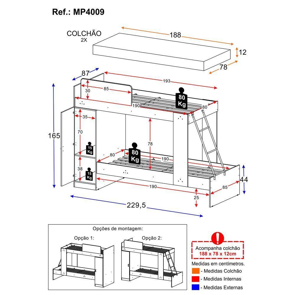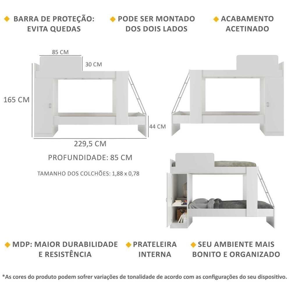 Beliche Com Colchão Incluso 1 Porta Havana Multimóveis BrancoProduzido em MDP com acabamento acetinado (cerca de 20% de brilho), o Beliche com Colchão Incluso 1 Porta Havana Multimóveis garante durabilidade e resistência. Suporta até 80kg em cada cama, possui barra de proteção na cama superior para evitar quedas, proporcionando noites de sono tranquilas e seguras, além de 1 porta lateral com prateleira interna, com amplo espaço interno para organizar roupas de cama ou pertences mais utilizados no dia a dia. A escada metálica em ângulo torna o acesso à cama superior muito mais fácil e prático. Além disso, o beliche pode ser montado dos dois lados - esquerdo ou direito. Acompanha colchões D23 com tratamento antiácaro e antialérgico que proporcionam noites de sono mais tranquilas e saudáveis. Esta é a escolha perfeita para aproveitar melhor os espaços do quarto para receber visitas ou acomodar seus filhos!Conteúdo da Embalagem:1 (um) Beliche2 (dois) ColchõesManual de MontagemKit FerragemDimensões do produto montado:Beliche - Altura: 165cm | Largura: 229,5cm | Profundidade: 87cmColchão - Altura: 12cm | Largura: 188cm | Profundidade: 88cm*Você pode consultar as medidas detalhadas na imagem técnica do produto.*As cores do produto podem sofrer variações de tonalidade de acordo com as configurações do seu dispositivo.Imagem meramente ilustrativa. Decoração não acompanha o produto.O produto será entregue desmontado e não disponibilizamos o serviço de montagem. Acabamento: Finish Foil | Cor: Branco | Material: MDP | Referência do Modelo: MP4009 | Coleção: Havana | Instruções de Cuidado: Limpar com pano seco para retirar o pó. Não utilizar produtos químicos ou abrasivos a limpeza. Não aplicar lustra móveis. | Sistema de Montagem: O produto acompanha manual de montagem juntamente com kit ferragem. O produto será entregue desmontado e não disponibilizamos o serviço de montagem. | Peso Suportado: 80 kg | Largura Montado: 229,5 | Tamanho (L x A x P): 229,5 x 165 x 87 | Peso do Produto: 85 | Produto: Beliche | Beliche: Sim | RBN: 17100649011 | Altura Montado: 165 | Produto Composto Por: 1 beliche, 2 colchões, manual de montagem e kit ferragem. | Acompanha Colchão: Sim | Profundidade Montado: 87 | Tonalidade: Branco | Com gaveteiro: Não | Requer Montagem: Sim | Garantia do Fabricante: 3 | Fabricante: Multimóveis | Tamanho da Cama: Solteiro | Altura (cm): 165 cm | Tipo de Cama: Beliche | Largura (cm): 229,5 cm | Comprimento (cm): 87 cm | Classificação da Cama: Solteiro | Estado de Origem: RS | Produto precisa de Montagem?: Sim, sugerimos a contratação do nosso serviço de montagem (para os CEPs em que o serviço está disponível) ou de algum experiente de sua preferência | Modelo de Cama: Beliche | Peso máximo suportado por cama: 80 kg | Padrão da Cama: Padrão | Altura do Produto com Embalagem: | Largura do Produto com Embalagem: | Comprimento do Produto com Embalagem: | Peso do Produto com Embalagem: | Nome do Produto no Fornecedor: Beliche com Colchão Incluso 1 Porta Havana Multimóveis Branco | Descrição do Tamanho: (L x A x P): 229,5 cm x 165 cm x 87 cm | Tempo de Garantia: 3 meses | Destaque 1: Produzido em MDP: maior durabilidade e resistência. | Destaque 2: Tamanho do Produto Montado (L x A X P): 229,5 cm x 165 cm x 87 cm | Destaque 3: Acompanha colchão. | Destaque 4: Peso Suportado: 80 kg. | Destaque 5: 90 dias de garantia legal para vícios ou defeitos de fabricação. | Peso (kg): 83,1 kg | FloorToTop (cm): 165 Centimetros | SideToSide (cm): 229,5 Centimetros | HeadToToe (cm): 87 Centimetros | Tipo de produto: bed | Marca: Multimóveis