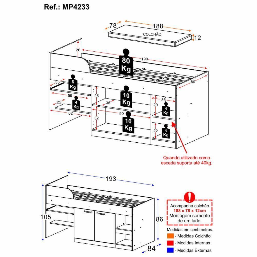 A Cama Solteiro Multifuncional com Colchão Incluso 2 Portas e Escrivaninha Multimóveis MP4233 é a solução ideal para otimizar o espaço no quarto. Produzida em MDP (15mm) com acabamento acetinado (cerca de 20% de brilho), garante durabilidade e resistência, suportando até 80kg. Suas barras em MDF e lastro em madeira oferecem qualidade, enquanto as prateleiras (suportam até 4kg em cada) servem para acomodar objetos decorativos e se transformam numa escada (suporta até 40kg) para acessar a cama, agregando funcionalidade. Além disso, possui uma escrivaninha embutida com prateleira e tampo (suporta até 6kg) com corrediças metálicas, que proporcionam mais leveza no manuseio. Possui 2 portas com puxadores em ABS, dobradiças metálicas e prateleira interna para organizar roupas de cama e outros itens. O design em curva na lateral oferece um visual moderno e delicado. Para noites de sono tranquilas e saudáveis, a cama acompanha colchão (suporta até 70kg) densidade D23 de espuma 100% poliuretano e tecido 100% poliéster, com tratamento anti-ácaro, anti-alérgico e antimofo. A montagem pode ser feita somente de um lado.Conteúdo da Embalagem:1 (uma) Cama1 (um) ColchãoKit FerragemManual de MontagemDimensões do produto montado:Cama - Altura: 105cm | Largura: 193cm | Profundidade: 84cmColchão - Altura: 12cm | Largura: 188cm | Profundidade: 78cm*Você pode consultar as medidas detalhadas na imagem técnica do produto.*As cores do produto podem sofrer variações de tonalidade de acordo com as configurações do seu dispositivo.Imagem meramente ilustrativa. Decoração não acompanha o produto.O produto será entregue desmontado e a Multimóveis não disponibiliza o serviço de montagem.