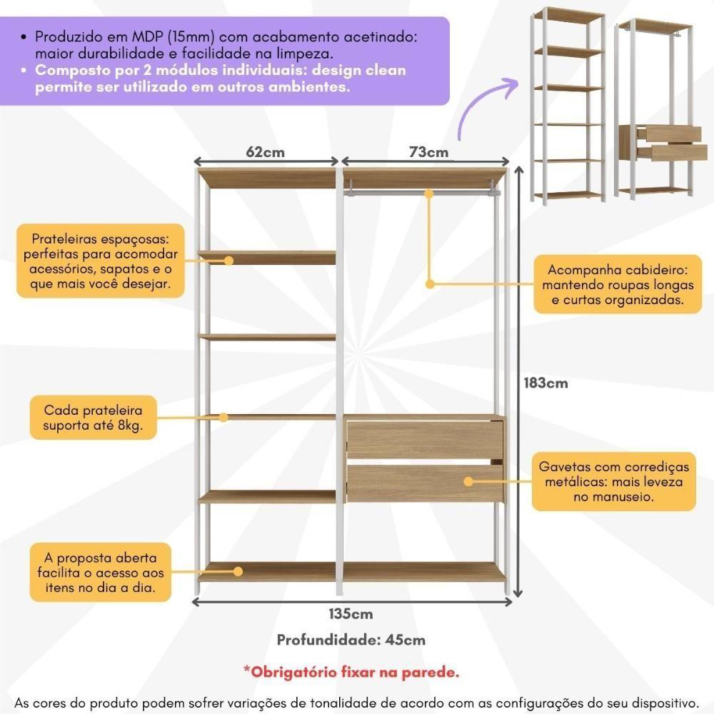 Guarda Roupas Closet Modulado 135cm 2 Peças Com 2 Gavetas E Cabideiro Multimóveis MP4320 Branco MadeiradoRenove seu ambiente com o Closet Modulado MP4320, a solução ideal para quem busca organização, funcionalidade e sofisticação. Com um design moderno e acabamento acetinado, ele se adapta perfeitamente ao seu espaço, proporcionando praticidade e elegância no dia a dia.Destaques do Produto:Material resistente: Produzido em MDP 15mm com acabamento acetinado (20% de brilho), garantindo durabilidade e um toque sofisticado.Amplo espaço interno: 7 prateleiras (suportam até 8kg cada) para acomodar roupas, calçados e acessórios.Gavetas práticas: 2 gavetas com corrediças metálicas, proporcionando suavidade no manuseio.Cabideiro revestido: Mantém suas roupas, sejam longas ou curtas, sempre impecáveis.Design modular: 2 módulos individuais permitem montagem personalizada conforme o seu ambiente.Dimensões do Produto Montado:Altura: 183 cmLargura: 135 cmProfundidade: 45 cmConsulte as medidas detalhadas na imagem técnica do produto.Conteúdo da Embalagem:1 Módulo com Prateleiras (62cm)1 Módulo com Gavetas e Cabideiro (73cm)Manual de MontagemKit FerragemEspecificações Técnicas:Material: MDP 15mmAcabamento: Pintura UV AcetinadoCorrediças: MetálicasCor: Branco/MadeiradoPeso do Produto: 49 kgQuantidade de Prateleiras: 7Quantidade de Gavetas: 2Quantidade de Cabideiros: 1 da Peça: Informações Importantes:Fixação obrigatória na parede para maior segurança.Produto entregue desmontado – serviço de montagem não incluso.Limpeza recomendada: Apenas pano umedecido com água (evitar produtos abrasivos).Imagem meramente ilustrativa – Decoração não acompanha o produto.Quantidade de caixas na embalagem: 2Dimensões do produto embalado:Altura: 18 cmLargura: 50 cmComnto: 188 cmPeso total: 49 kg