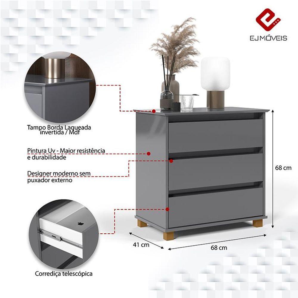 Mesa De Cabeceira Quarto Mini Cômoda Ej Com 3 Gavetas Cinza Cinza Marca: EJ Móveis; Linha: Quarto;Modelo: Mini Cômoda EJ;Material da mesa de cabeceira: MDP/MDF 15mm;Acabamento: Pintura;Altura: 68 cm;Largura: 68 cm;Profundidade: 41 cm;Quantidade de portas: Não se aplica;Tipo de dobradiças: Não se aplica;Quantidade de gavetas: 03;Tipo de corrediças: telescópicas;Com puxador:Não se aplica;Material do puxador: Não se aplica;Quantidade de prateleiras: não se aplica;Com rodas: Não;Quantidade de mesas de cabeceira: 01;Requer montagem: Sim (kit montagem incluso);Condição do item: Novo;É kit: Não;Altura da embalagem: 14,5 cm;Largura da embalagem: 42,5 cm;Comprimento da embalagem: 69 cm;Peso: 24,000 kg;Embalagem do envio: Papelão e plástico;Informações adicionais:- Os objetos que ambientam as fotos não acompanham o produto;- O produto será entregue desmontado- É de inteira responsabilidade do cliente a montagem do produto e/ou instalação, custos de transporte por escadas e/ou elevadores, guincho ou içamento, assim como possíveis irregularidades provenientes de manuseio inadequado;- Embora o produto acompanhe o manual de montagem, verifique a complexidade antes de decidir montá-lo sozinho, recomendamos que contrate um profissional de sua confiança;- Fique atento, nossas cores podem sofrer alterações dependendo do seu monitor;- ANTES DE MONTAR O SEU PRODUTO, certifique-se que todas as instruções dispostas no manual, bem como todas as ferragens descritas, estejam presentes dentro da embalagem. Verifique se há alguma peça danificada, caso esteja, prestaremos a devida assistência dentro do prazo da garantia.Fabricante: EJ Móveis | Altura do Produto Montado: 68 | Largura do Produto Montado: 68 | Comprimento do Produto Montado: 41 | Altura do Produto Embalado: 14,5 | Largura do Produto Embalado: 42,5 | Comprimento do Produto Embalado: 69 | Peso do Produto Montado: 24 | Peso do Produto Embalado: 24 | Cor: Colorido | Material para Filtro: MDF/MDP | Estado de Origem: SP | Conteúdo da Embalagem: 01 mesa de cabeceira, 01 manual de montagem | Descrição do Tamanho: Único | Nome do Produto: Mesa de Cabeceira Mini Cômoda EJ | Garantia em Meses: 03 meses de garantia para defeito de fabricação | Instruções/Cuidados: Recomenda-se limpar o produto com flanela ou pano macio seco, não utilizar produtos abrasivos, desengordurantes, álcool ou solvente. Mantê-lo em lugar livre de umidade e/ou exposição direta ao sol | Produto Precisa de Montagem?: Sim, sugerimos a contratação do nosso serviço de montagem (para os CEPs em que o serviço está disponível) ou de algum profissional experiente de sua preferência | Produto Infantil: Não | Tonalidade: Multicolorido Cor: Cinza