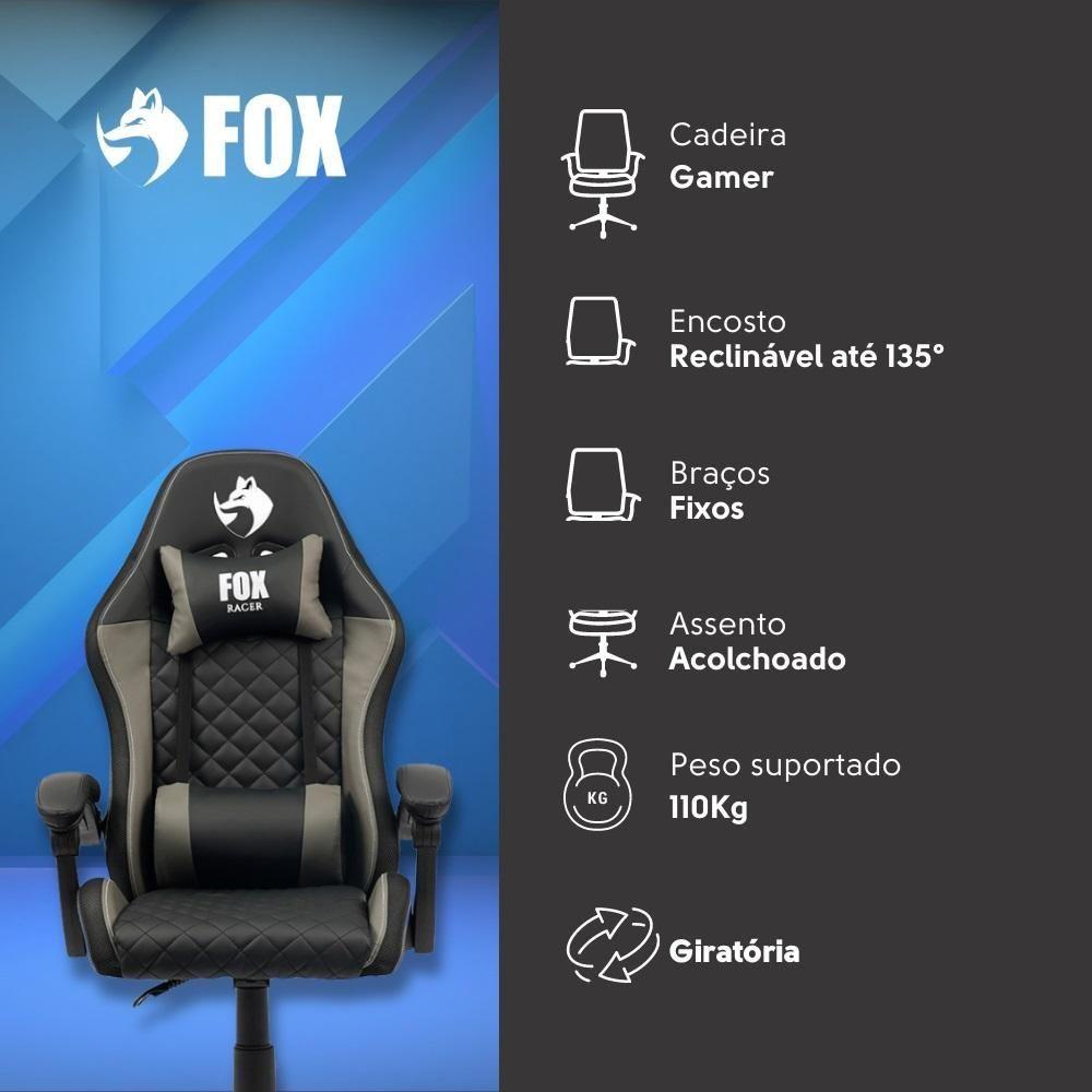 Cadeira Gamer Fox Racer Vulpes Cinza WZ-318Cadeira Gamer Fox Racer Vulpes CinzaApresentamos a Cadeira Gamer Vulpes da Fox, perfeita para os entusiastas que buscam o equilíbrio entre estilo, conforto e economia! Com um design moderno e atraente que vai deixar seu espaço de jogo mais elegante, ela oferece o máximo conforto para suas longas sessões de gameplay a um preço acessível.Principais Características:Conforto Ergonômico: Desenhada para longas horas de uso, possui formato ergonômico que se adapta ao corpo e acompanha almofadas removíveis para a lombar e a cervical, garantindo o suporte ideal.Ajuste de Altura e Inclinação: A cadeira conta com ajuste de altura e um encosto que reclina em até 135 graus, permitindo que você encontre a posição mais confortável para jogar ou descansar.Base Giratória e Rodas Antirrisco: A base giratória em 360 graus oferece total liberdade de movimento, enquanto as rodinhas em nylon deslizam com facilidade e protegem o piso contra arranhões.Estrutura Robusta: Com pistão classe 2 e uma estrutura que suporta até 110 kg, a cadeira garante e durabilidade para o uso diário.Especificações Técnicas:Marca: Fox RacerModelo: Vulpes WZ-318Tipo: Cadeira GamerPeso Máximo Suportado: 110 kgReclino do Encosto: Até 135°Pistão: Classe 2Almofadas: Lombar e cervical (removíveis)Cor: CinzaAltura Máxima da Cadeira: 133 cm (aproximadamente)Altura do Assento ao Chão: 48 - 58 cmLargura do Assento: 37 cmProfundidade do Assento: 48 cmGarantia: 3 meses