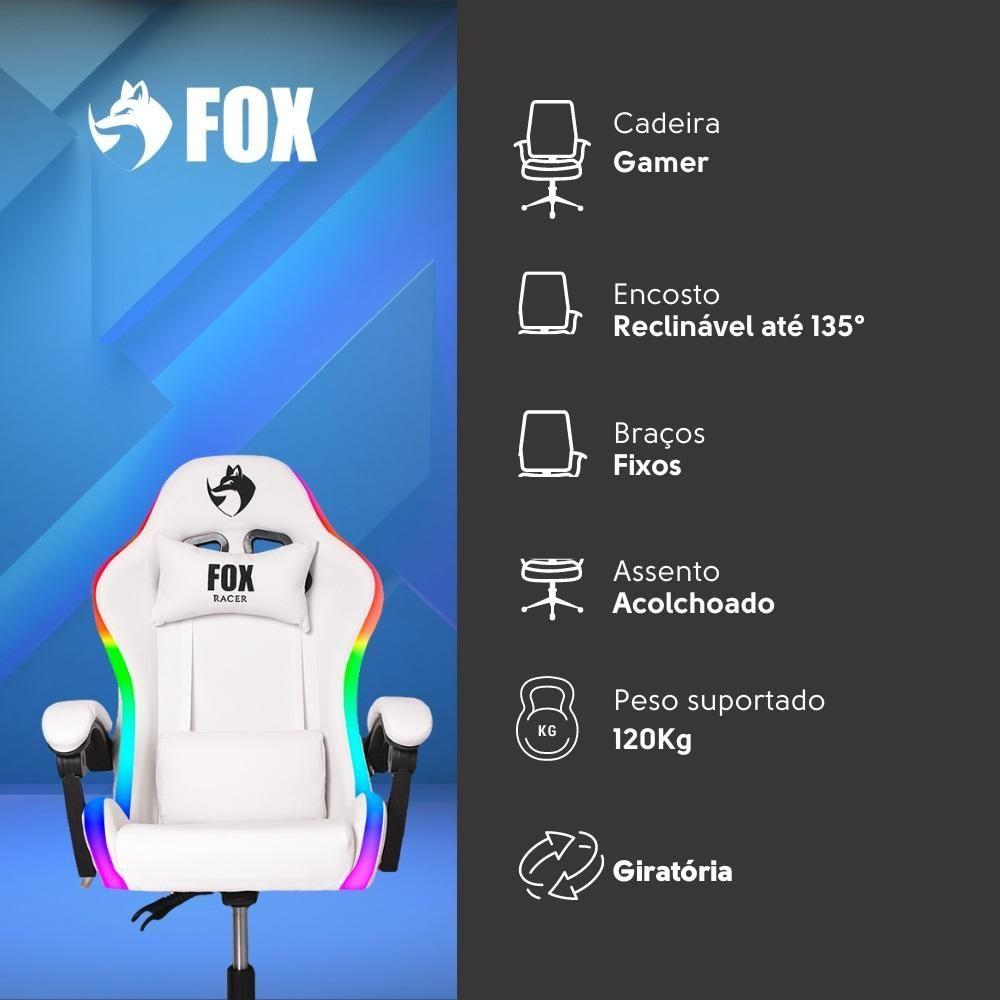 Cadeira Gamer Fox Racer Nordic Branca B98O modelo Nordic RGB da Fox Racer, foi desenvolvido para todo player que tem a necessidade de ajustes e adaptações na sua cadeira, para que usufrua de grande conforto, sem maiores investimentos.Jogue sem limitesDesenhada para usuários adeptos a jogos on-line que passam muitas horas frente ao computador ou vídeo game, o assento e encosto se ajusta em diferentes posições. Desfrute do lazer sem descuidar da lombar, dorsal e cervical. O formato ergonômico que se adapta perfeitamente em seu corpo.Cadeira GiratóriaDiferente da cadeira com sua base fixa, a cadeira giratória permite que você gire 360 graus facilitando e trazendo velocidade ao seu deslocamento quando necessário, seja ao redor da mesa no seu ambiente de trabalho ou em sua residência.RodinhasAs rodinhas das cadeiras FOX proporcionam excelente proteção ao piso, evitando arranhões. Possuem uma resistência regular a impacto, e bom deslizamento trazendo eficácia e velocidade na sua locomoção.EspecificaçõesMarca: FoxModelo: B98Categoria: GamerCor: Branca + RGB com controle remoto 7 cores em modos personalizadosBraços: Apoio fixoConforto: Espuma de alta densidadeGiratório: SimApoio para pés: NãoPistão: Class 2Ângulo inclinação encosto: 135 grausAlmofada: lombar e cervical removíveisPeso suportado: até 120kgsRodas: NylonMontada: NãoAltura assento ao chão: 32cm - 40cmAltura da cadeira: 101cm – 110cmLargura do assento: 49cmLargura interna assento: 40cmProfundidade do assento: 49cmObservações- Limpar com pano macio seco ou umedecido com água;- O tom da cor do produto pode variar de acordo com lote e/ou características do seu monitor ou tela;- Garantia legal de 90 dias para de fabricação;- Caso os fios conectores do LED não estejam visíveis, abrir o zíper e verificar dentro do encosto;- Fotos Meramente ilustrativas.