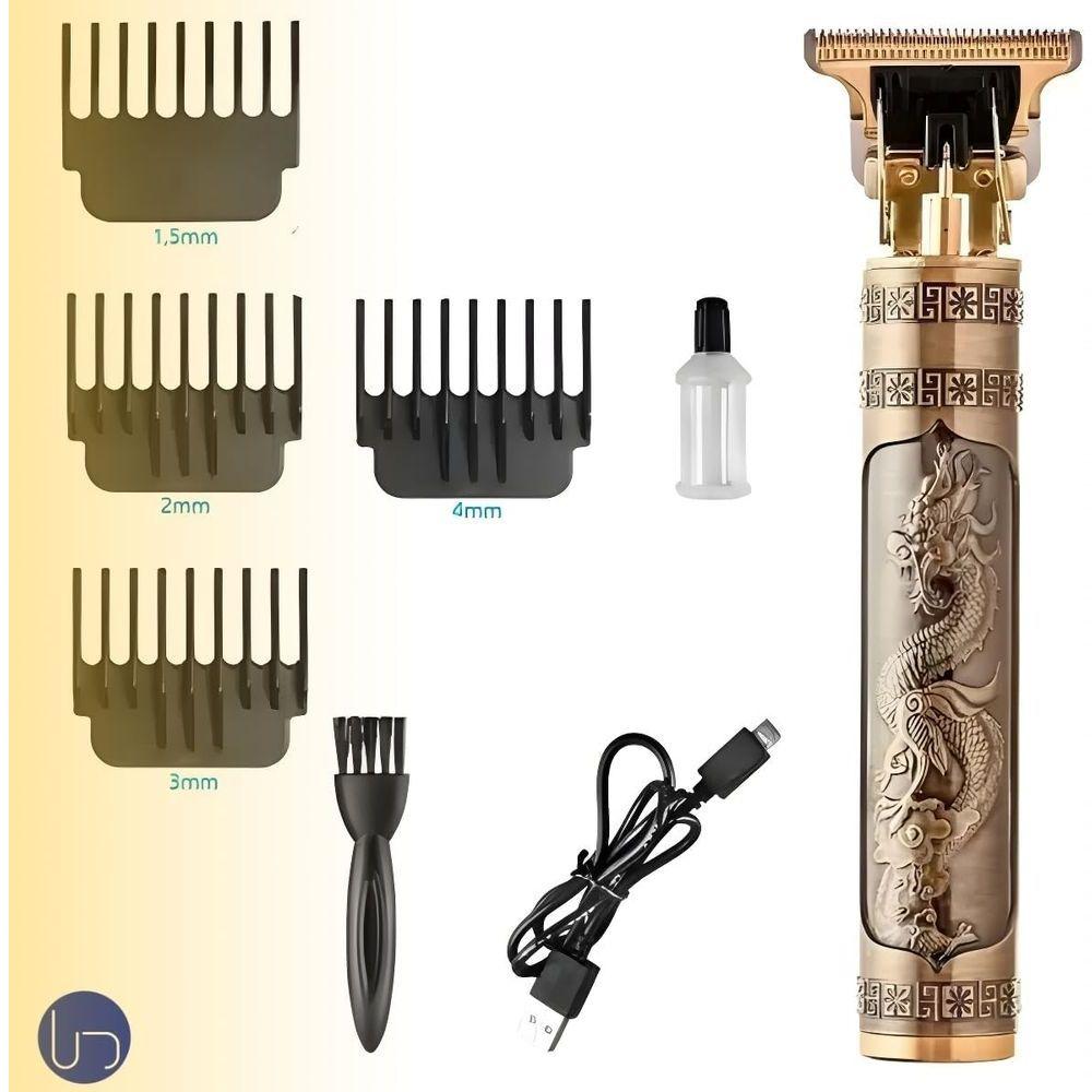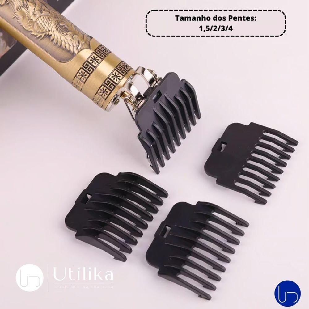 Maquina Cortar Cabelo Utilika® Em Aço No Zero Ultra Afiada T9 Maquininha DragãoEsta Máquina além de possuir um designer único, traz em sua lâmina um formato T, que facilita na hora de fazer marcações e acabamentos, contando também com uma visão limpa das lâminas permitindo mais precisão e agilidade.Perfeita para o seu dia a dia e para Profissionais de Barbearia trazendo mais produtividade e estilo. Fácil de limpar, resistente a água e com um motor potente chegando a 7.000 rotações por minuto.Uso de última geração e altíssimo desempenho.O design pequeno e o peso foram projetados na medida certa para facilitar os cortes, desenhos e acabamentos mais precisos.Acabamento de cabelos e barba / corte de cabelo e barba/ pezinho / desenhos / depilação (peito, perna, braço, axila, costas e íntimo).Lâminas de aço carbono com corte afiado e durável, material seguro que não machuca a pele, bateria de 1200 mA carregue por 3 horas e use por mais de 120 minutos.Pode ser usada para:– Aparar a barba;– Cortar o cabelo;– Fazer o pezinho e marcações;– Acabamentos e disfarces;– Desenhos;– Depilar o peitoral, axilas, costas e pernas.Olha só quantas Qualidades!– Sem fio, mais mobilidade pra você;– 5W de potência, baixo ruído, motor mais silencioso;– Não precisa remover a bateria para carregar, basta plugar o cabo;– Bateria de 1500mAh com duração de 180min ininterruptos, com apenas 3hs de carga;– Compacta, leve e ergonômica;– Portátil, Leve em suas viagens;– Corpo em Metal, com acabamento vintage em alto relevo;– Troca rápida de pentes;– Carregue em qualquer entrada USB (Power Bank, computadores e etc.);– Bivolt 110/220vItens inclusos:4 x Pentes1 x Escovinha de limpar1 x Óleo da lamina1 x Carregador USB1 x Maquina vintage