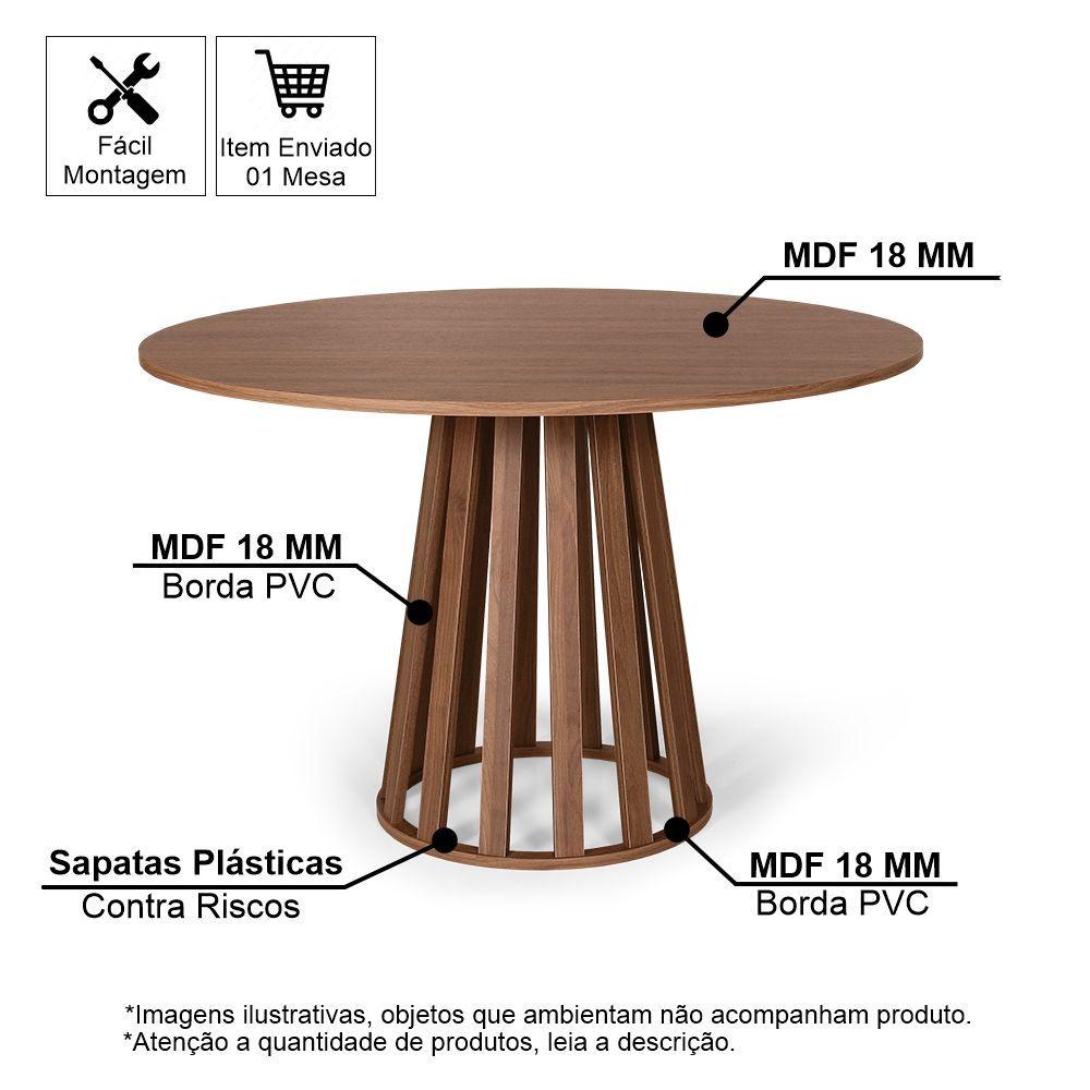 Mesa De Jantar Redonda 6 Lugares 120cm Tália Noronha - Straub WebMesa de Jantar Redonda 6 Lugares 120cm Tália - Straub WebA Mesa de Jantar Tália possui um design moderno e exclusivo, uma ótima solução para compor cozinhas, salas de jantar, áreas de festa, bares e varandas cobertas. Oferecendo requinte e sofisticação para seu ambiente, suas medidas permitem acomodar até 6 pessoas confortavelmente, torne seus momentos à mesa ainda mais agradáveis. A Mesa Tália conta com design exclusivo e inovador, seu tampo conta com linhas e cortes retos em suas laterais, proporcionando maior charme para seu espaço. Sua base ripada possuí design único e marcante, oferecendo maior estabilidade e elegância para o produto.Materiais de QualidadeSua base e tampo são produzidos em MDF 18MM com acabamento em borda de PVC, material que garante maior segurança e durabilidade ao produto, seu acabamento em melamina fosca oferece mais leveza e beleza ao móvel, deixando seu espaço com um toque charmosos e moderno.Especificações Técnicas do ProdutoAltura: 78,00 (cm)Largura: 120,00 (cm)Profundidade: 120,00 (cm)Formato do Tampo: RedondoMaterial do Tampo: MDF 18,00 (mm)Acabamento do Tampo: Borda PVCMaterial da Base: MDF 18,00 (mm)Acabamento da Base: Borda PVCEscala de Brilho: FoscoPés com Regulagem de Altura: NãoResistência: Aproximadamente 60,00 (Kg)Peso Unitário: 32,00 (Kg)Produto Enviado: Desmontado, acondicionado em caixa de papelão reforçada.Produtos Entregues: 01 Mesa de Jantar (Demais produtos são meramente ilustrativos, não fazendo parte da entrega);Garantia: 03 Meses Contra Defeitos de Fabricação.Limpeza e Manutenção: Não manter em área externa e com umidade excessiva, não utilizar produtos abrasivos, limpe com água e sabão.Produto Necessita Montagem: Sim, acompanha manual de montagem e parafusos (não nos responsabilizamos pela montagem do produto).