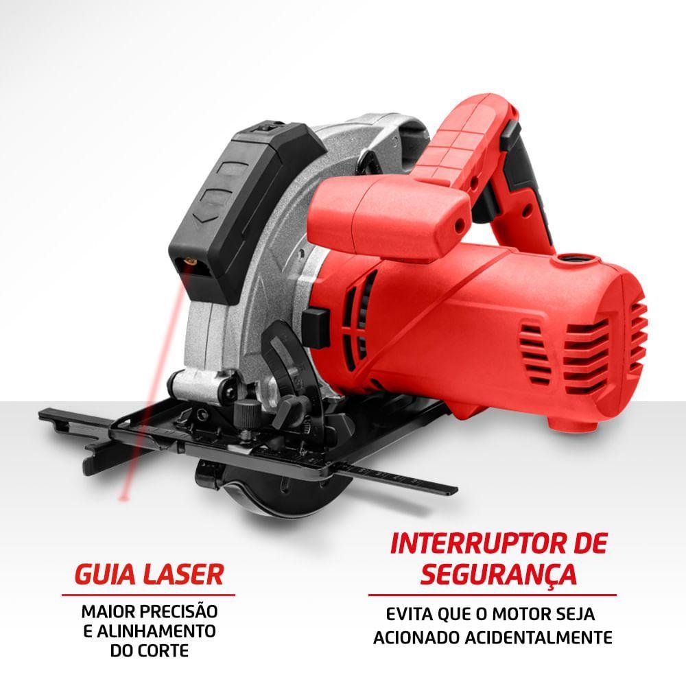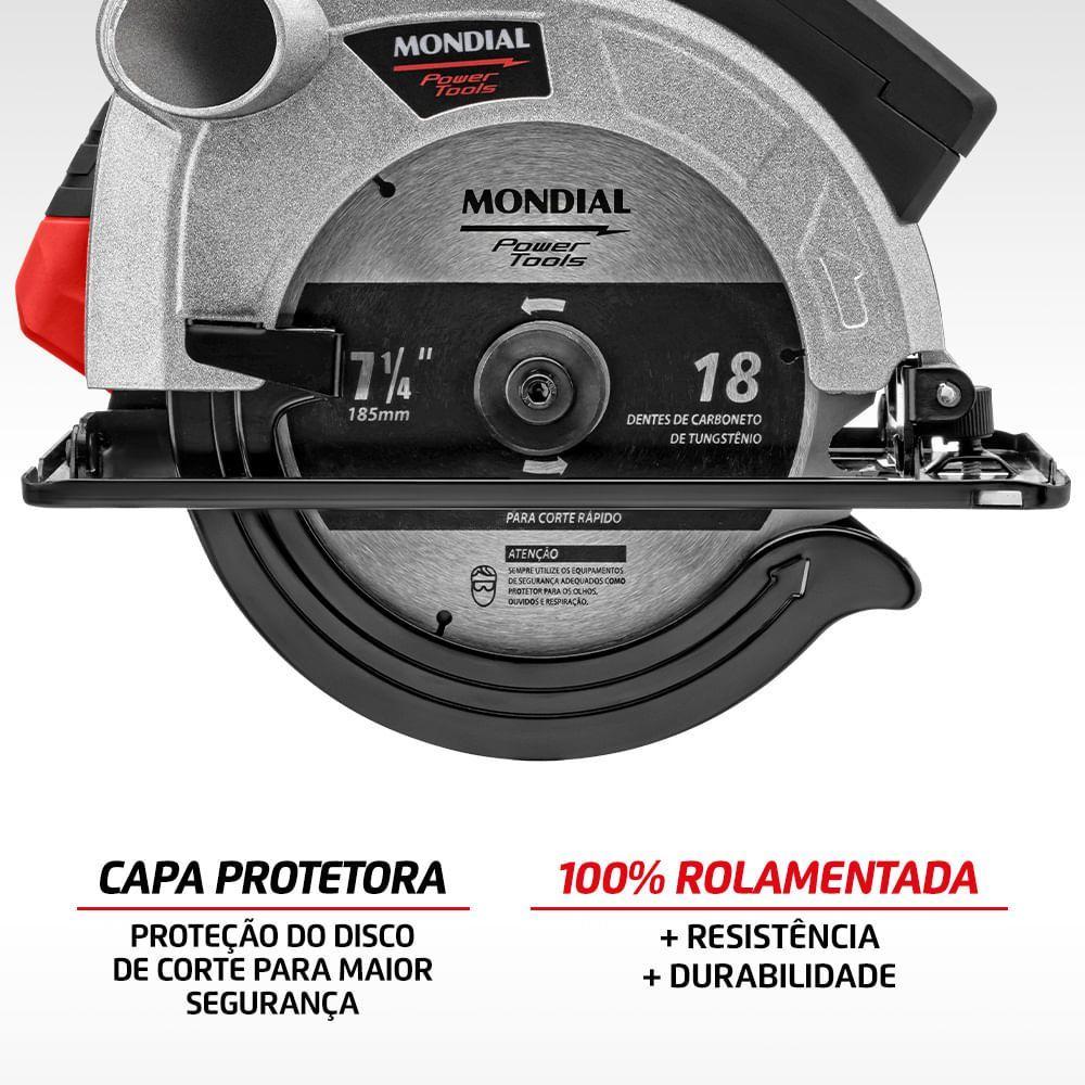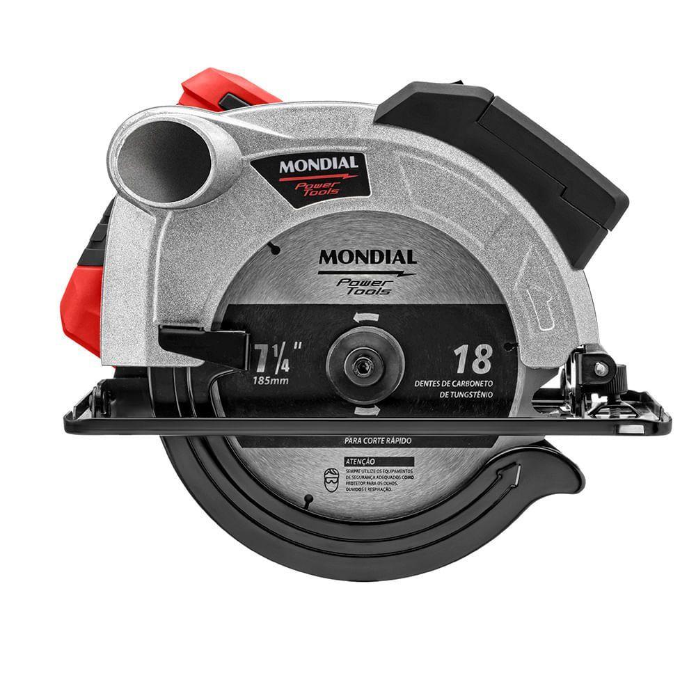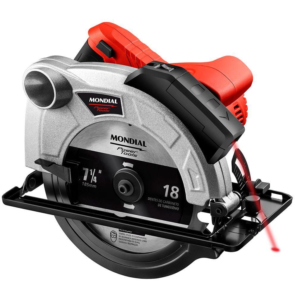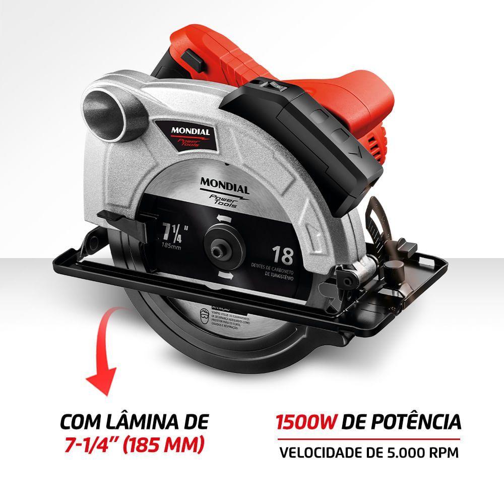 Serra Circular Mondial Power Tools Fsc-03 Serra Circular-220v-vermelhoA Serra Circular FSC-03 vermelha tem 1.500W de potência, 5.000 RPM de velocidade e lâmina de 7-1/4" (185 mm). Ela vem com guia laser, ajuste de profundidade e de ângulo, capa protetora e interruptor de segurança. Mais potente e mais rápida, ela tem motor de 1.500W e atinge até 5.000 RPM. Sua lâmina é de 7-1/4" (185 mm). Seu guia laser proporciona mais precisão e alinhamento para você fazer qualquer corte. Ela também tem uma base com regulagem de profundidade e ajuste de ângulo, o que permite você fazer o melhor corte em vários ângulos, de 0° a 45°. Sua capa protetora protege o disco de corte, dando mais segurança para você. E seu interruptor de segurança evita que o motor seja acionado acidentalmente. A Serra Circular 1.200W FSC03 ainda tem uma alça ergonômica e emborrachada, dando ainda mais segurança e conforto para você usá-la. Com 1 ano de garantia Mondial, garantia de fábrica.Modelo - FSC-03Cor - Preto/VermelhoVoltagem (Tensão) - 127V/220VItens inclusos - 01 Serra Circular e Manual de InstruçõesPotência - 1500WTamanho do disco - -Disco de corte - SimVelocidade - 5.000 rpmGuia laser - SimBase com regulagem de profundidade - SimGuia ajustável para cortes em ângulos - SimÂngulo de inclinação da base - SimProfundidade de corte a 45° - SimProfundidade de corte a 90° - SimTamanho da lamina - 7-1/4" (185)Capa protetora do disco - SimInterruptor de segurança - SimAlça ergonômica emborrachada - Sim100% rolamentada - Simbocal de saída de pó - -Fixador do guia paralelo - -Cabo de energia - 2mDimensões do produto - 23,50cm x 28cm x 24cm (AxLxP)Peso - 3,690kgGarantia - 1 ano