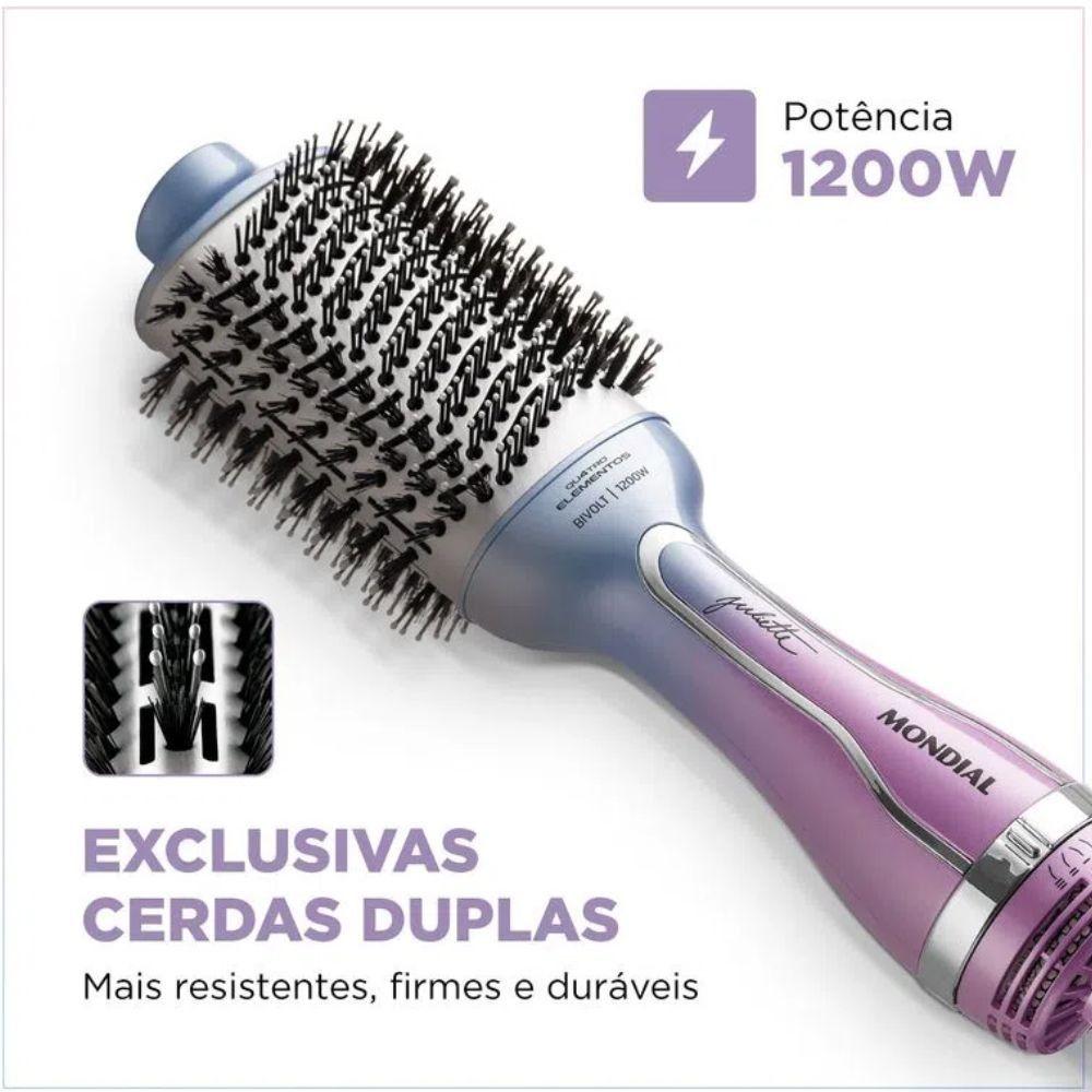 Escova Secadora Mondial By Juliette ES-JU-03 Azul/Rosa BivoltRevestimento especial com quatro Elementos: Revestimento enriquecido com infusao de Ceramica, Titanio, Tourmaline e Nano Silver. Os 4 elementos, juntos, protegem seus fios e garantem uma aparencia mais saudavel aos cabelos.3 EM 1: O poder do secador aliado a facilidade da escova. Voce seca, alisa e modela ao mesmo tempo, com uma unica mao.Exclusivas cerdas Duplas: Mais resistentes, duraveis e firmes para alisar e modelar seus cabelos, potencias de 1200W, alta potencia para uma secagem rapida e eficientes.Bivolt: Voltagens em 127V e 220V, basta ajustar a chave seletora e usar sua escova em qualquer lugar, com suporte de apoio para apoiar a sua escova e ajudar a preservar a forma das cerdas.Especificações TécnicasMarca: Mondial Modelo: ES-JU-03Voltagem: BivoltNumero de velocidades: 2 velocidadesControle de temperatura: SimPotencia: 1200WNiveis de temperaturas: 3 Niveis de TemperaturaFuncoes: Seca, escova e modelaCabo giratorio: SimAltura: 37,5 cmLargura: 10,5 cmProfundidade: 8,5 cmPeso: 550grGarantia: 12 meses