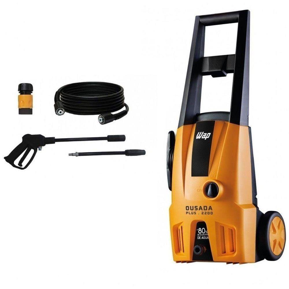Lavadora De Alta Pressão Ousada Ultra 2200 Laranja Com Preto 110V A lavadora de alta pressao WAP Ousada Plus 2200 ULTRA e a melhor opcao para as limpezas mais exigentes no seu dia a dia, oferecendo mais pressao, potencia e eficiencia com um otimo custo-beneficio.E ideal para lavar calcadas, bicicletas, motos, carros e paredes com rapidez e agilidade, alem de economizar ate 80 de agua se comparada a mangueira tradicional.Pratica e robusta, a WAP Ousada Plus 2200 ULTRA vem equipada com alca e rodas que facilitam o transporte, mangueira de alta pressao de 3 metros, mangueira desentupidora de 2 metros, trava de seguranca do direcionador, bico regulavel (concentrado ou leque) e o sistema stop total, que corta o fluxo de agua e a energia do motor ao soltar a alavanca, poupando energia e aumentando a vida util do motor.Esse sistema tambem traz mais seguranca para trabalhar com sua WAP em qualquer ambiente. Para deixar o trabalho ainda mais dinamico, ela vem equipada com o engate rapido, para voce montar e desmontar a mangueira em um clique, sem a necessidade de usar ferramentas.Especificações TécnicasMarca: Ousada Modelo: Ousada UltraVoltagem: 110VPotencia eletrica: 1500WPressao maxima: 1750 PSIMotor: UniversalVazao: 342 l/hCorrente eletrica: 13 A/ 7,5 AAltura: 65 cmLargura: 26 cmProfundidade: 26 cmPeso: 4,6 kgGarantia do fornecedor de 12 meses.
