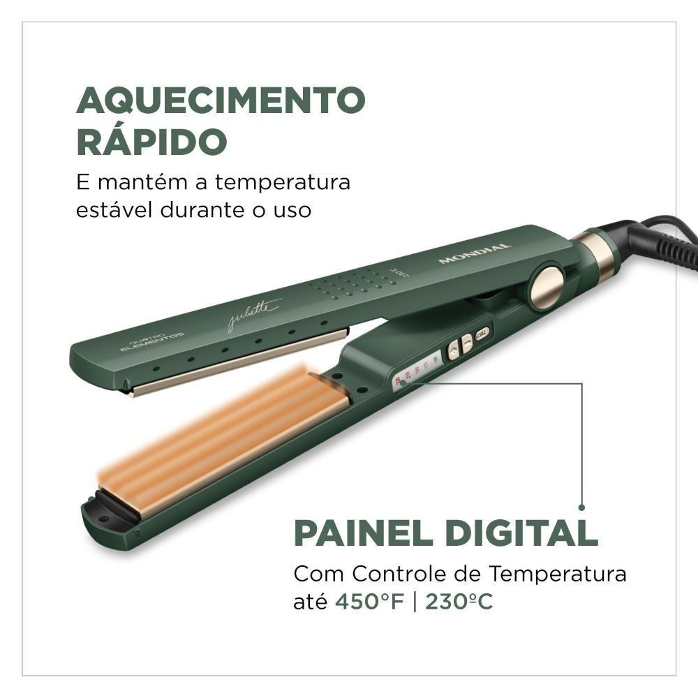 Prancha Alisadora Juliette Mondial P-JU-02 Verde BivoltA Prancha Alisadora da Linha by Juliette Qu4tro Elementos traz um revestimento especial enriquecido com infusão de Cerâmica, Titânio, Tourmaline e Nano Silver. Juntos, esses 4 elementos protegem seus fios e garantem uma aparência mais saudável aos cabelos, com brilho intenso, maciez e sem frizz.Diferenciais do Produto:Revestimento Especial Qu4tro Elementos: A fusão de Cerâmica, Titânio, Tourmaline e Nano Silver distribui o calor uniformemente, protege os fios, reduz o frizz e garante um cabelo com brilho e aparência saudável.Painel Digital com Controle de Temperatura: Oferece 5 opções de temperatura, de 150°C a 230°C, permitindo um alisamento perfeito e adequado para os mais diferentes tipos de cabelo.Aquecimento Rápido e Estável: Atinge a temperatura máxima de 230°C rapidamente e a mantém estável durante todo o uso, garantindo um resultado eficiente.Design Prático e Seguro: O cabo giratório de 2,5 metros garante mais liberdade de movimento, enquanto a trava de segurança permite guardar a prancha de forma prática e segura.Bivolt Automático: Ideal para levar em viagens, pode ser utilizada em ambas as voltagens (110V e 220V) sem a necessidade de ajustar uma chave seletora.Especificações Técnicas:Marca: MondialModelo: by Juliette Qu4tro Elementos P-JU-02Voltagem: BivoltCódigo: P-JU-02Tipo: Prancha Alisadora / ChapinhaNíveis de Temperatura: 5 (150°C a 230°C)Display: LCD DigitalCor: Golden RoséComprimento do Cabo: 2,5 metros (giratório 360°)Revestimento das Chapas: Cerâmica, Titânio, Tourmaline e Nano SilverPeso: 390 gDimensões [AxLxP]: 4 x 31,5 x 3,5 cmGarantia: 12 meses