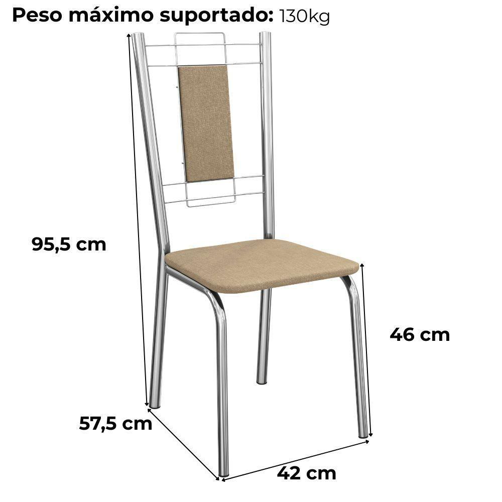 Kit 2 Cadeiras Cromada Sala Jantar 2c005cr Corino Capuccino Kappesberg CapuccinoConjunto 2 cadeiras 2C005, ideais para salas de jantar ou recepções. Estrutura em MDP (15 mm), corpo/ pés tubular em alumínio (encosto com tubo 1 1/4 com parede de espessura 0,9mm e arame 0,5mm e assento com tubo 1 com parede de espessura 0,9mm). Estofadas com espuma D26 e revestido em Corino (material sintético que imita couro) garantindo conforto, durabilidade e fácil limpeza. Possui sapatas para proteção ao piso. Este produto será entregue em 01 volume.DimensõesAltura: 99,5 cmLargura: 42 cmProfundidade: 57,5 cmAltura do assento: 46 cm Especificações TécnicasModelo: FlorençaMateriais: Alumínio, MDP, Espuma e Tecido.Estilo: ModernoAmbiente: Sala de JantarPeso máximo suportado: 130kg. Sistema de montagemParafuso.Manual de montagem incluso.Montagem, desmontagem e outras instalações serão de responsabilidade do cliente! Recomendação de LimpezaPara a limpeza, utilize um pano seco para retirada do pó.Evite o uso de produtos abrasivos e o contato direto com a umidade. Ideal para compor ambientes com praticidade e conforto. Importante SaberAs imagens são meramente ilustrativas, não acompanham objetos de decoração e eletrônicos.A tonalidade da cor do produto pode variar de acordo a calibração de cores do seu monitor, a iluminação do ambiente ou sua percepção visual.O cliente deve verificar a quantidade de VOLUMES descritos na nota, a situação da embalagem, caso haja algum dano NÃO ASSINE o comprovante de recebimento e RECUSE a mercadoria.Não nos responsabilizamos por subir escadas/elevadores ou pelo transporte por guincho em apartamentos. Eventuais despesas são de responsabilidade do comprador.Confira as dimensões do produto e certifique-se de que passarão normalmente por supostos elevadores, portas, escadas ou corredores de sua residência. Recomendamos que o responsável pelo recebimento confira se os produtos entregues correspondem ao modelo e à quantidade adquirida. Garantia De Fábrica90 dias para eventuais defeitos de fabricação.NA Cor: Capuccino